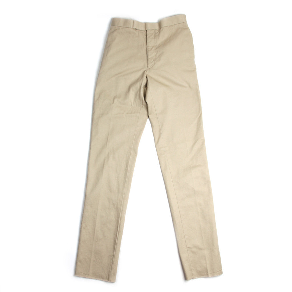 A cotton twill chino slack. RWB grosgrain tab at the back waist with a buckle back for extra security. Unfinished bottom so you can set your own length and hem style.