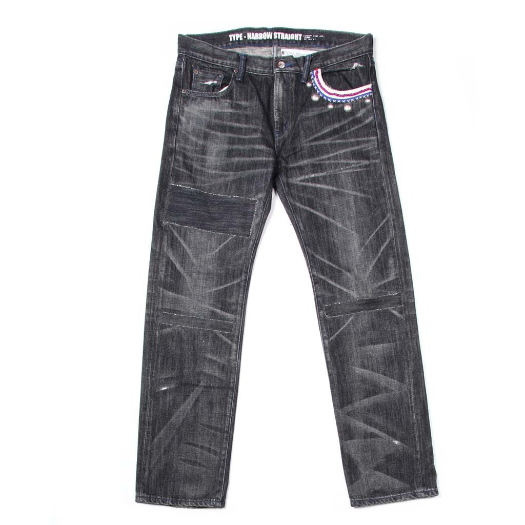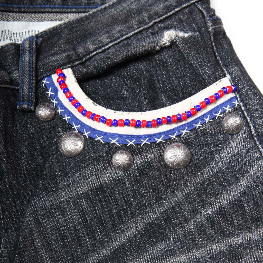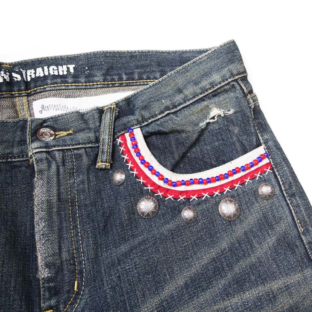 Slim fit...Level 4 Savage denim with beads and silver conchos on the edge of the left front pocket. Patching, restitching, and distressing all over!