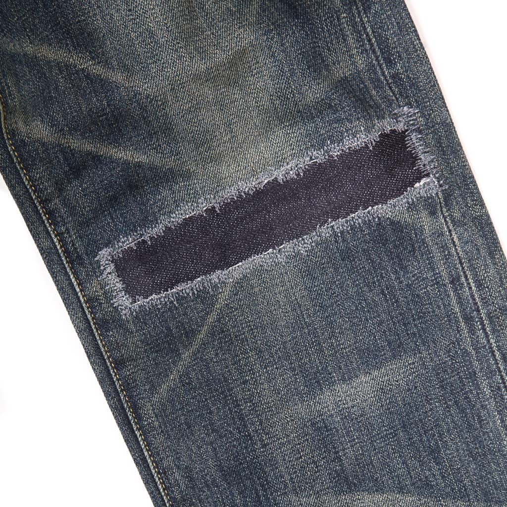 Selvedge denim with selvedge stripes running down the outseam.