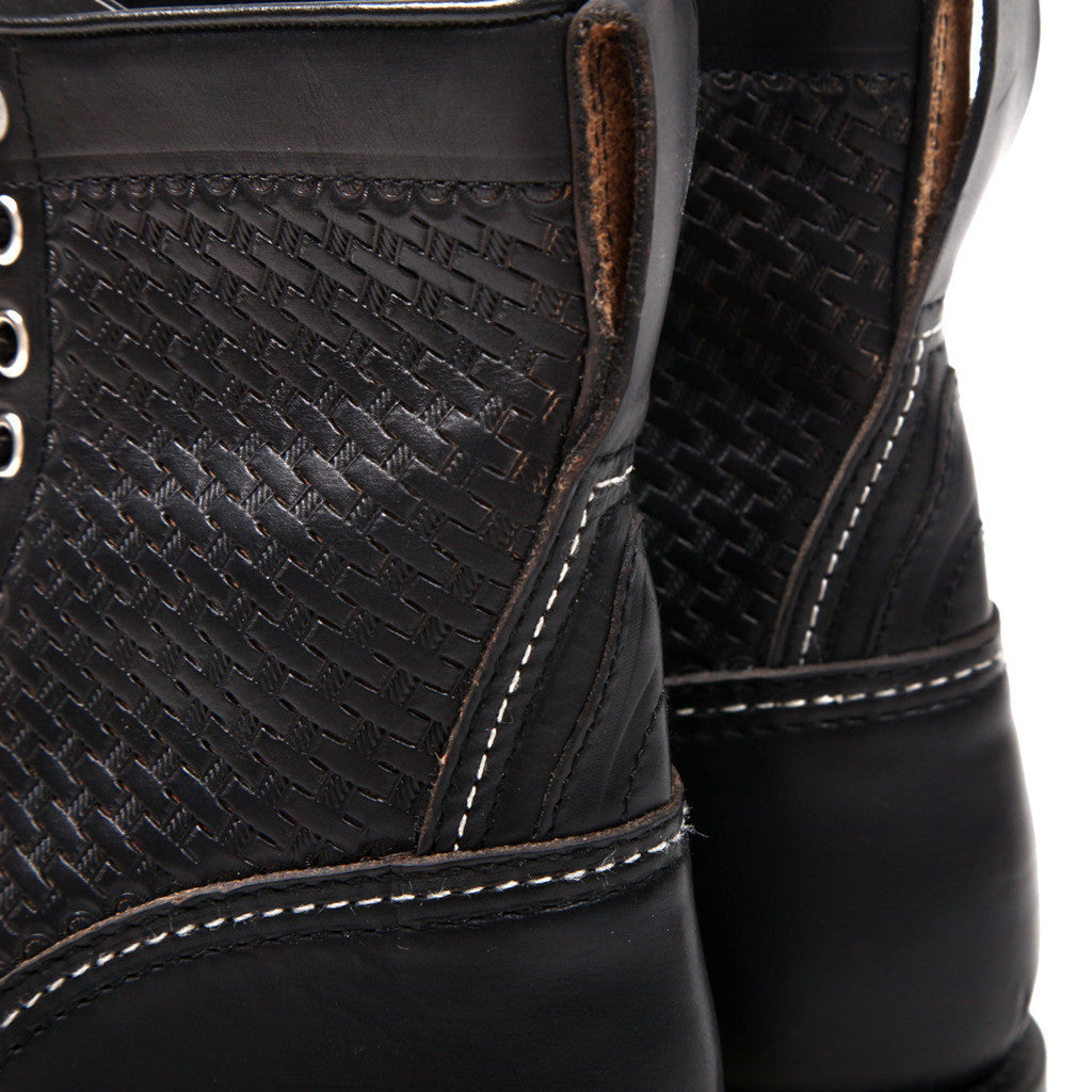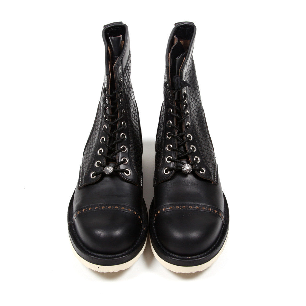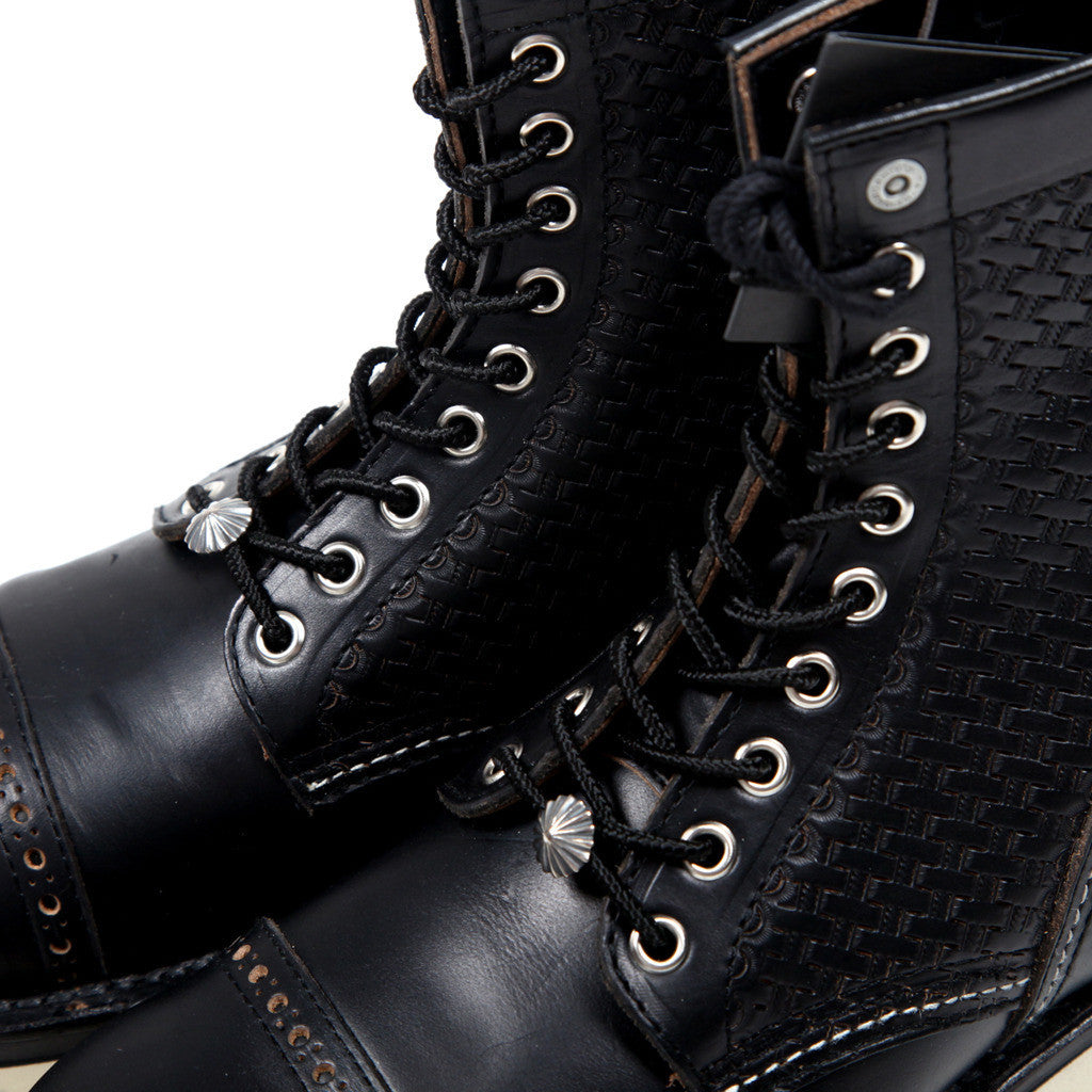 The body of the boot is oiled up Horween Chromexcel which is known for it's durability and water resistance. Has a basket pattern in the whole upper shaft. Brogued edge toe cap. The tough nylon laces have a vintage 1920's 925 silver parachute style concho attached.