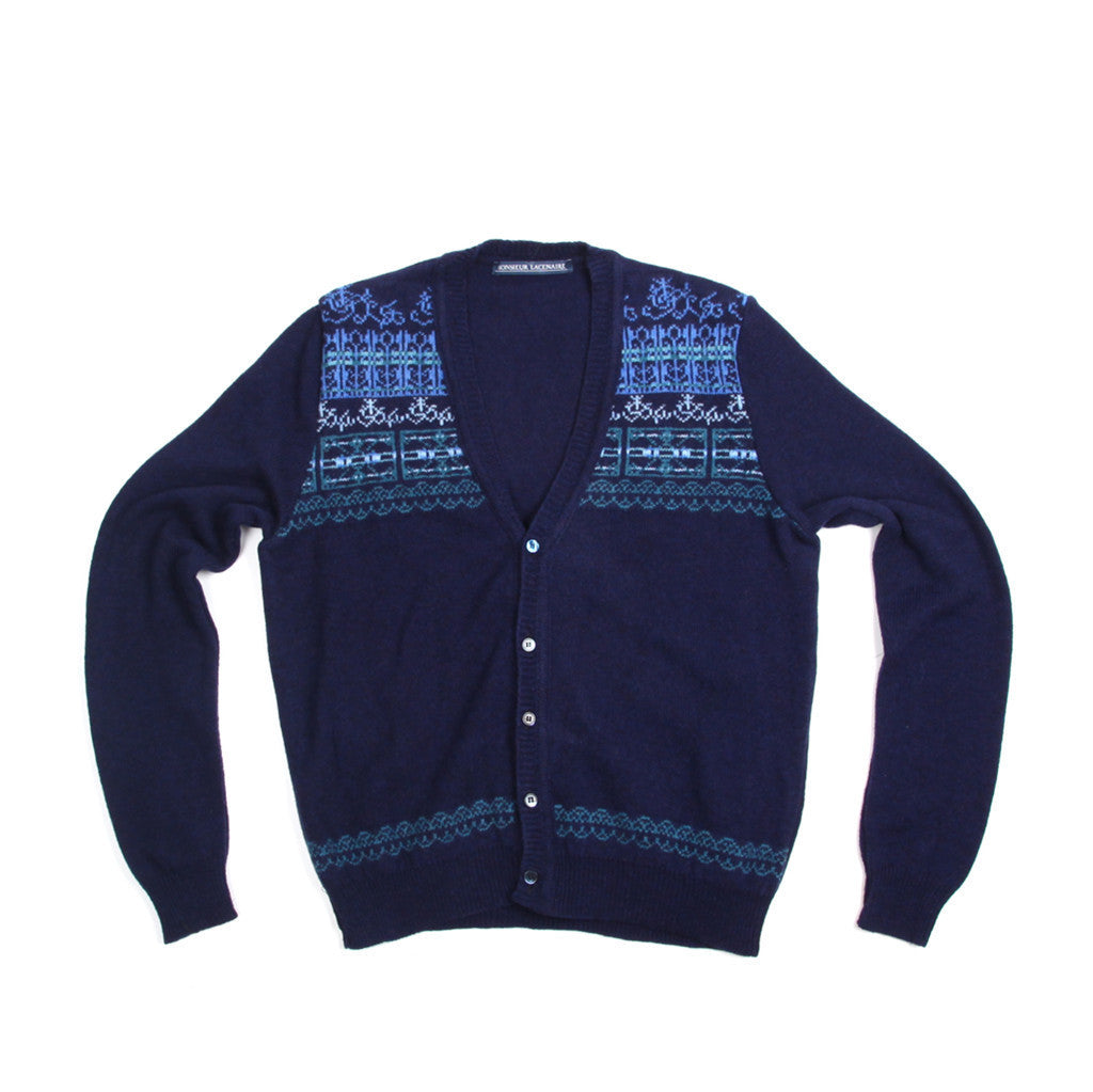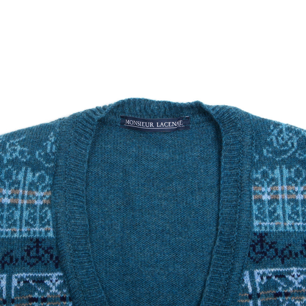 Made of a merino wool, the cardigan features a contrast fair isle pattern. Ribbed trim to hold its structure along with a V-neckline and tonal buttons.