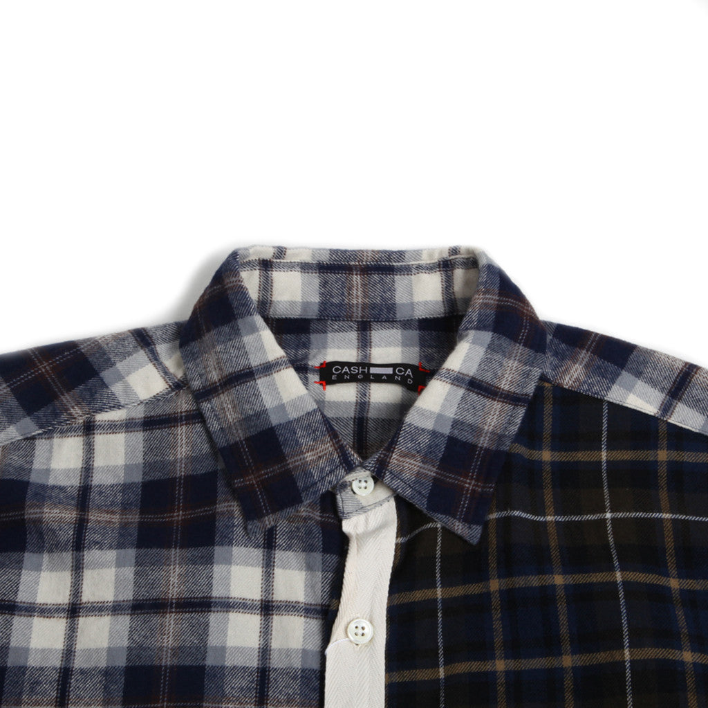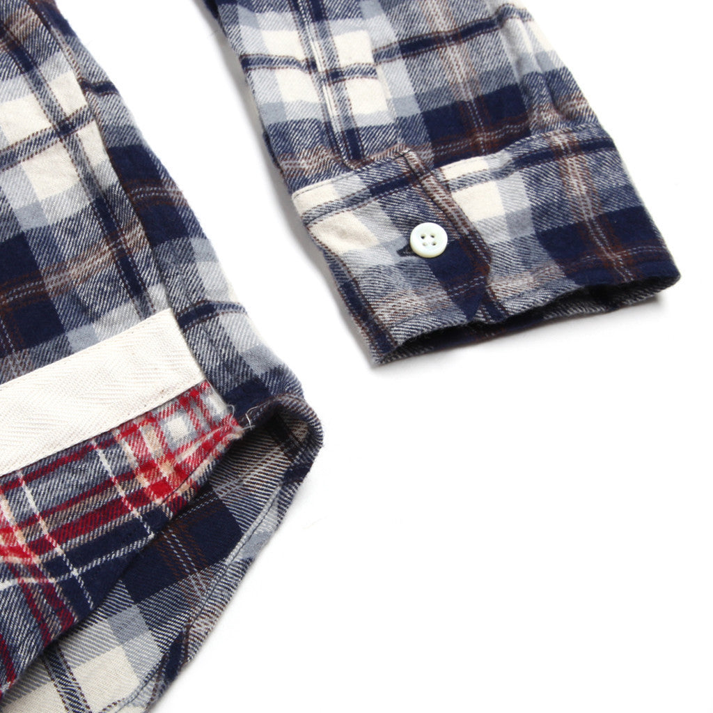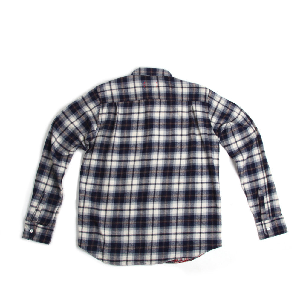 A mixed plaid flannel button down shirt with red contrast bar tack detail at the back yoke.