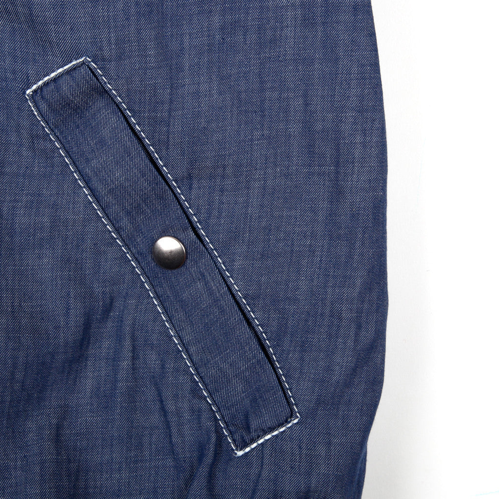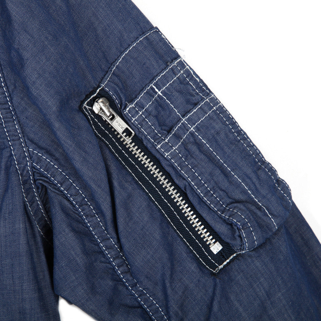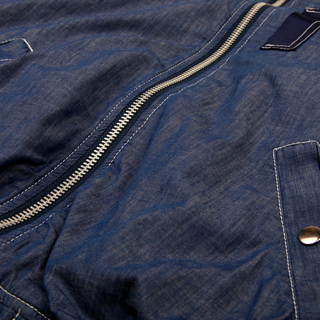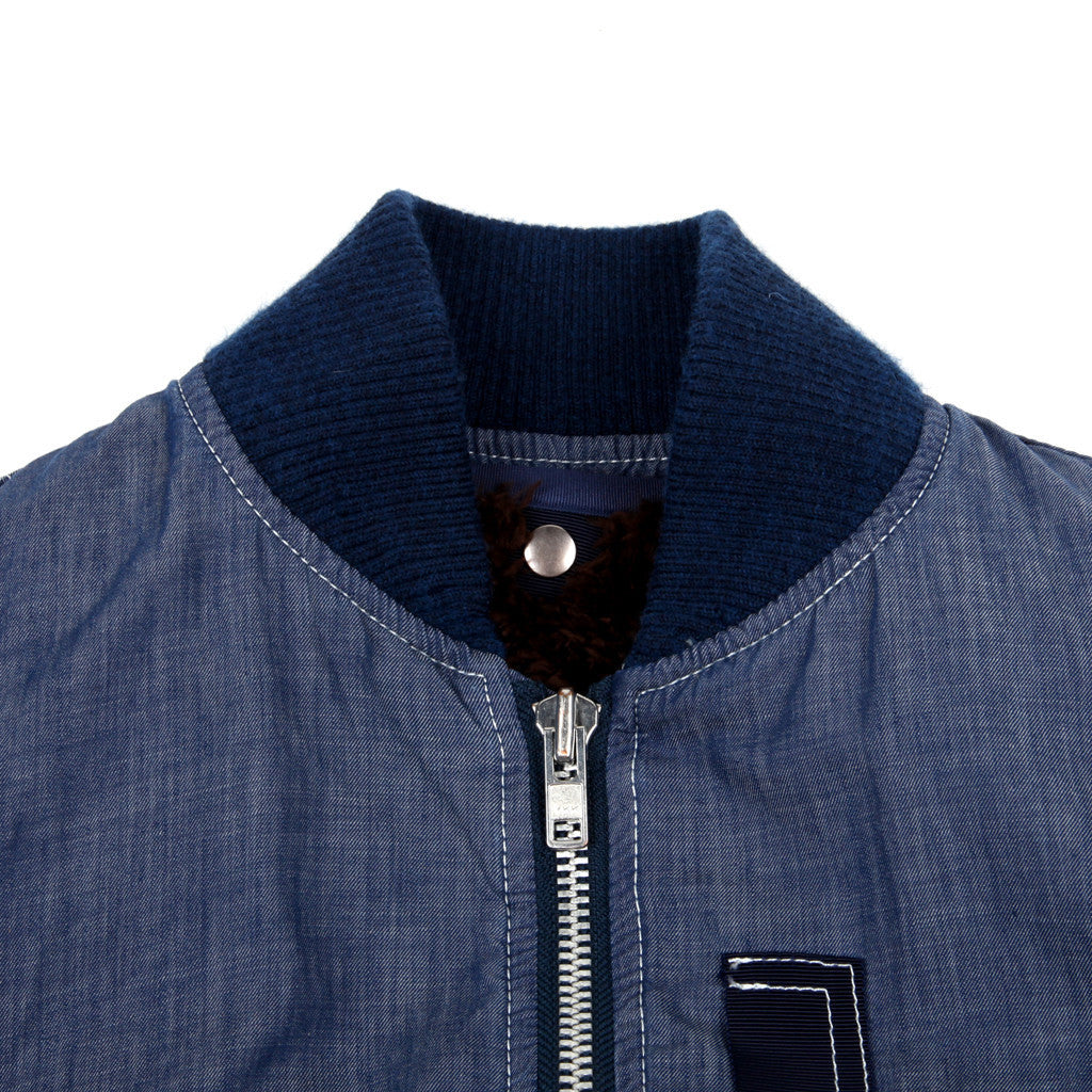 Lightweight indigo twill MA-1 with snap out polar fleece pile liner.