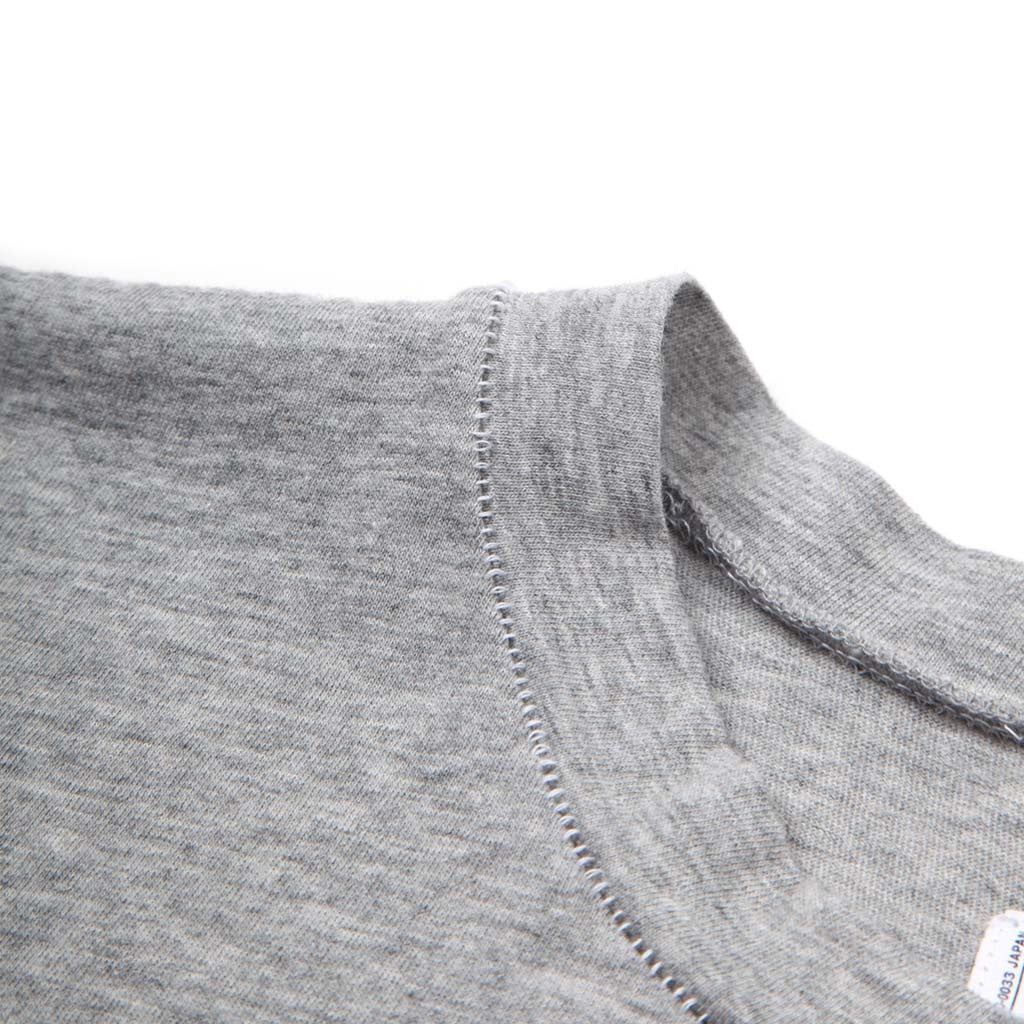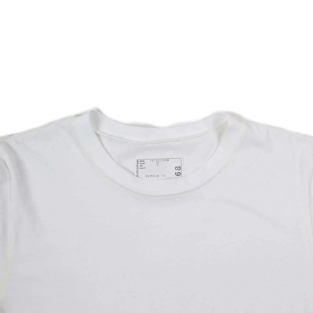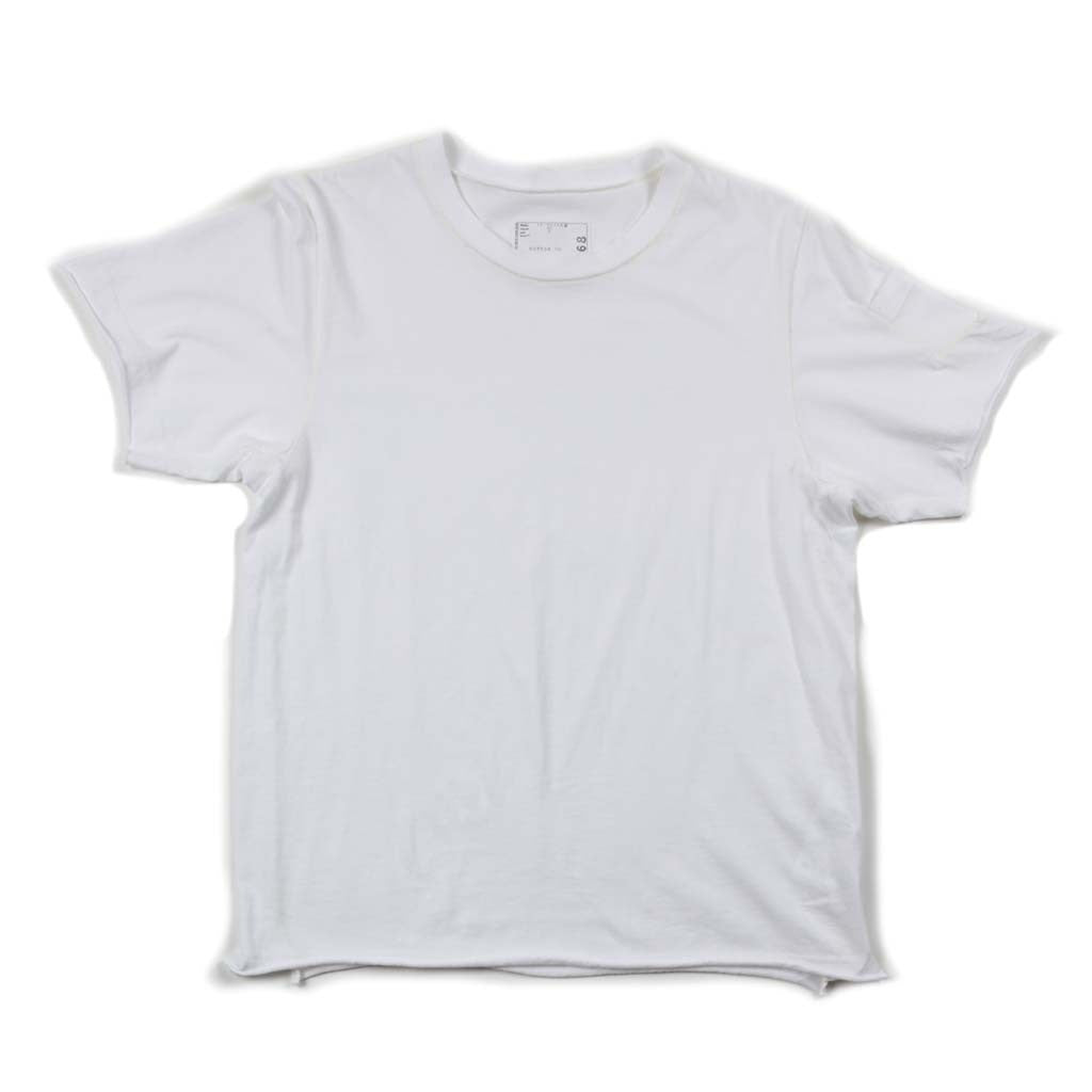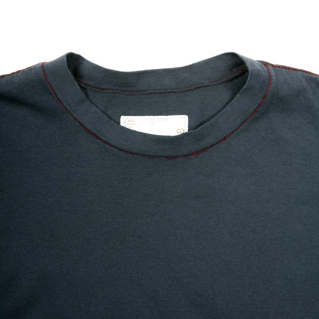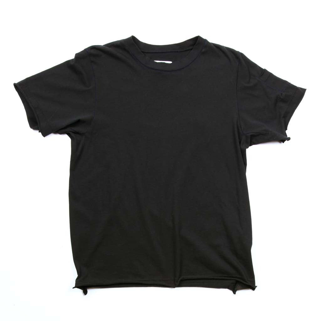 Crew neck Tees with contrast stitch and small inset patch pocket on sleeve. Raw edges on cuffs and hem. Grosgrain gusset detail.