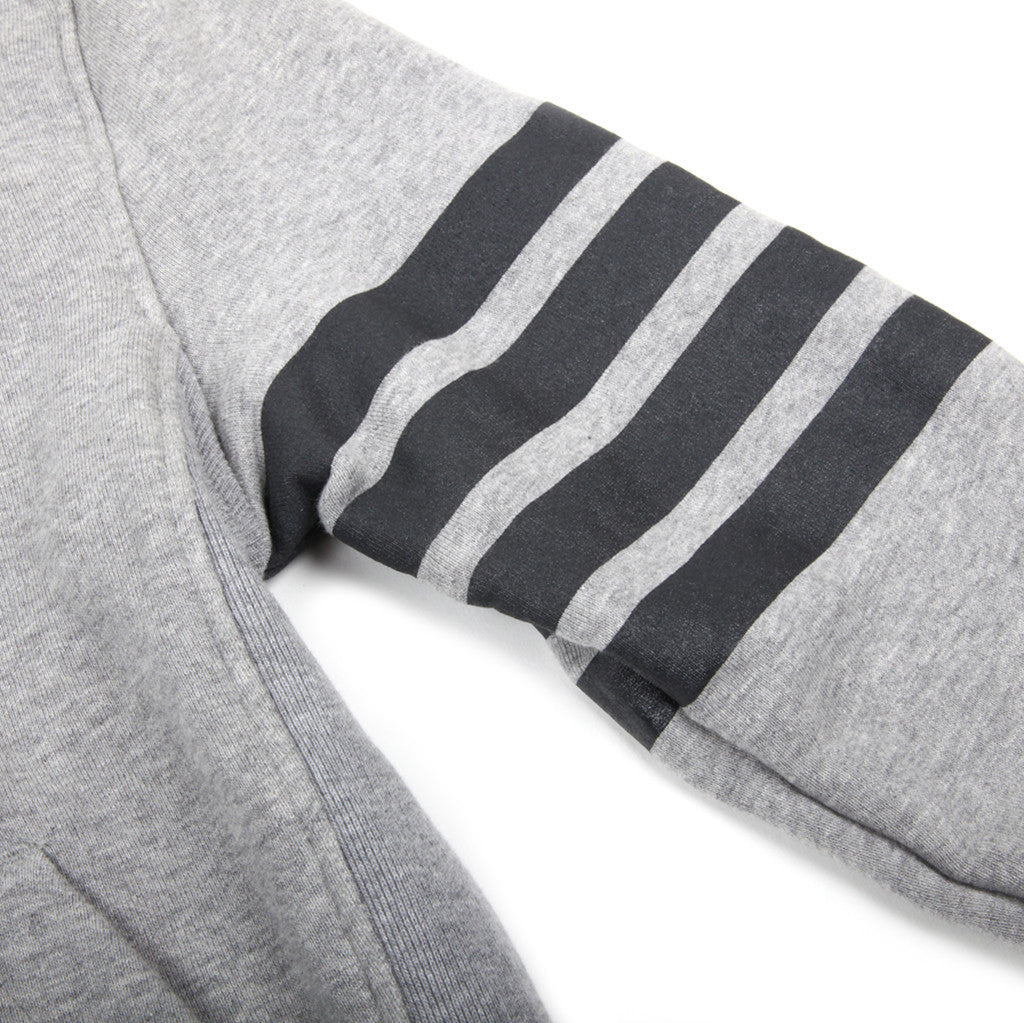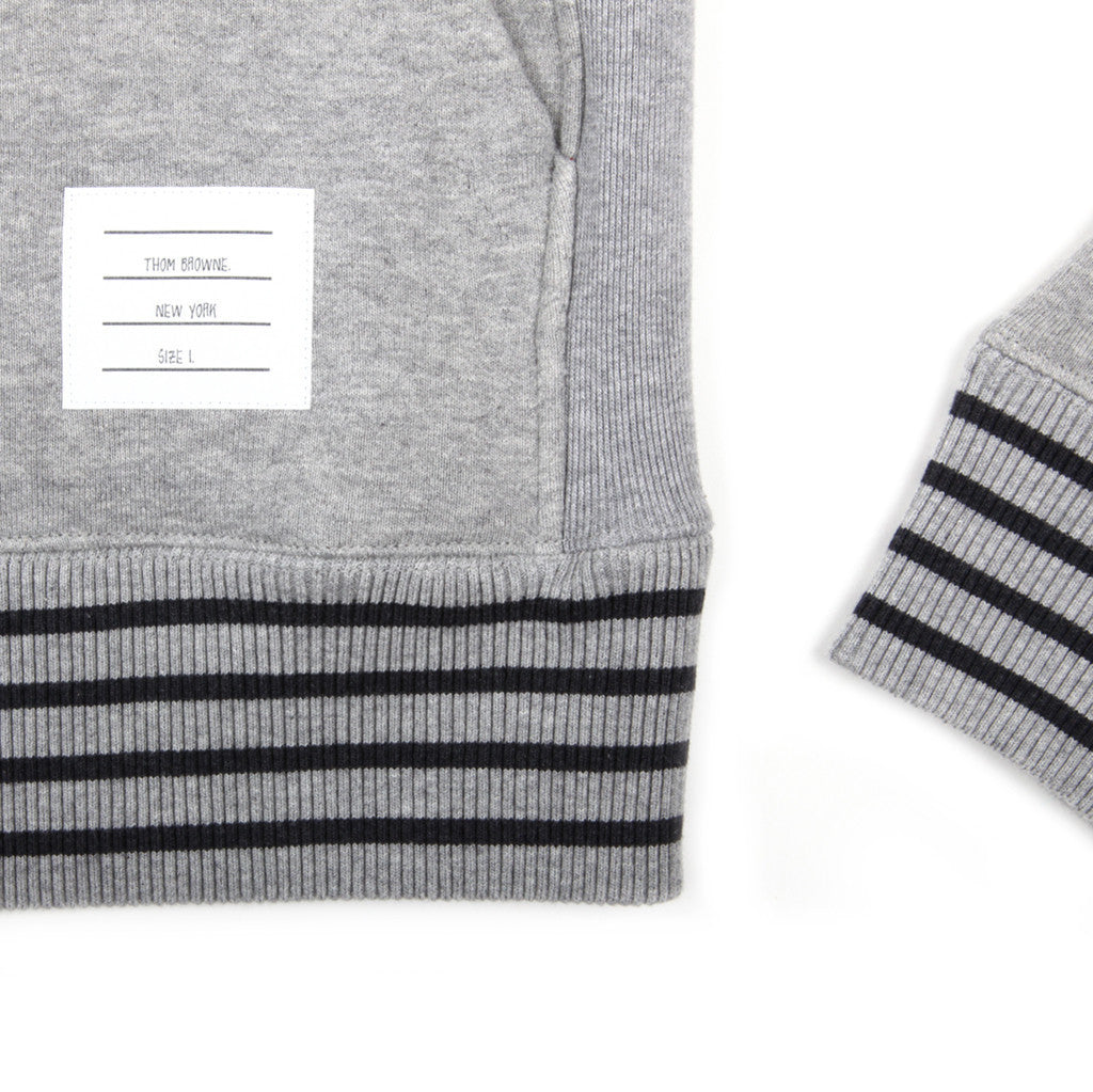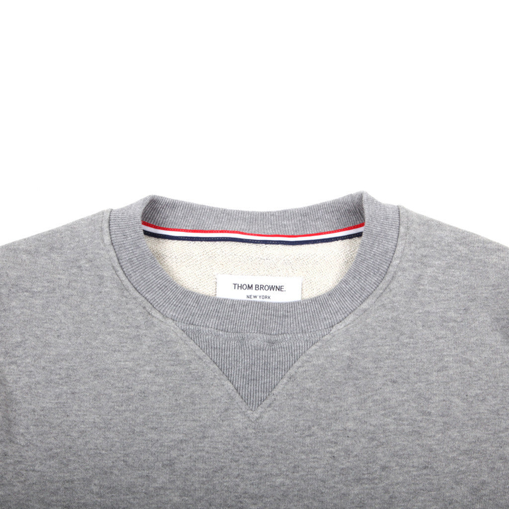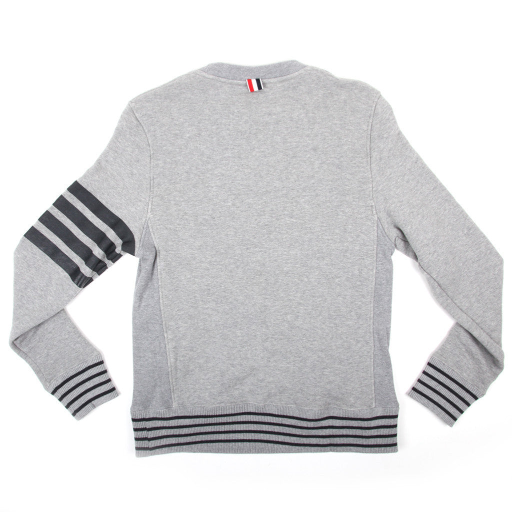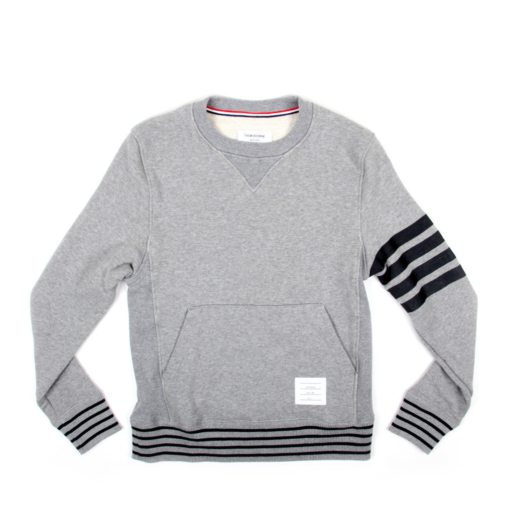 Classic Thom Browne cotton French terry crew neck sweatshirt with Navy 4 bar sleeve stripes and kangaroo pocket.