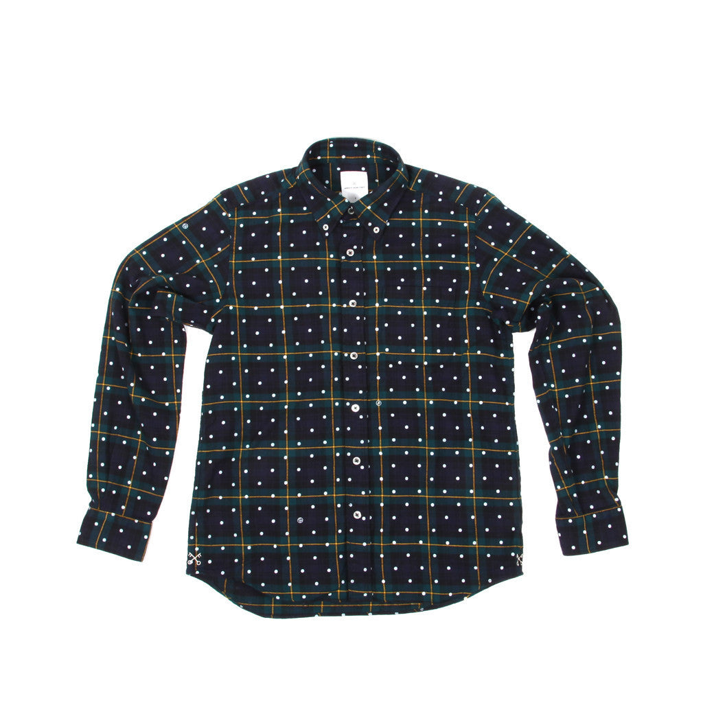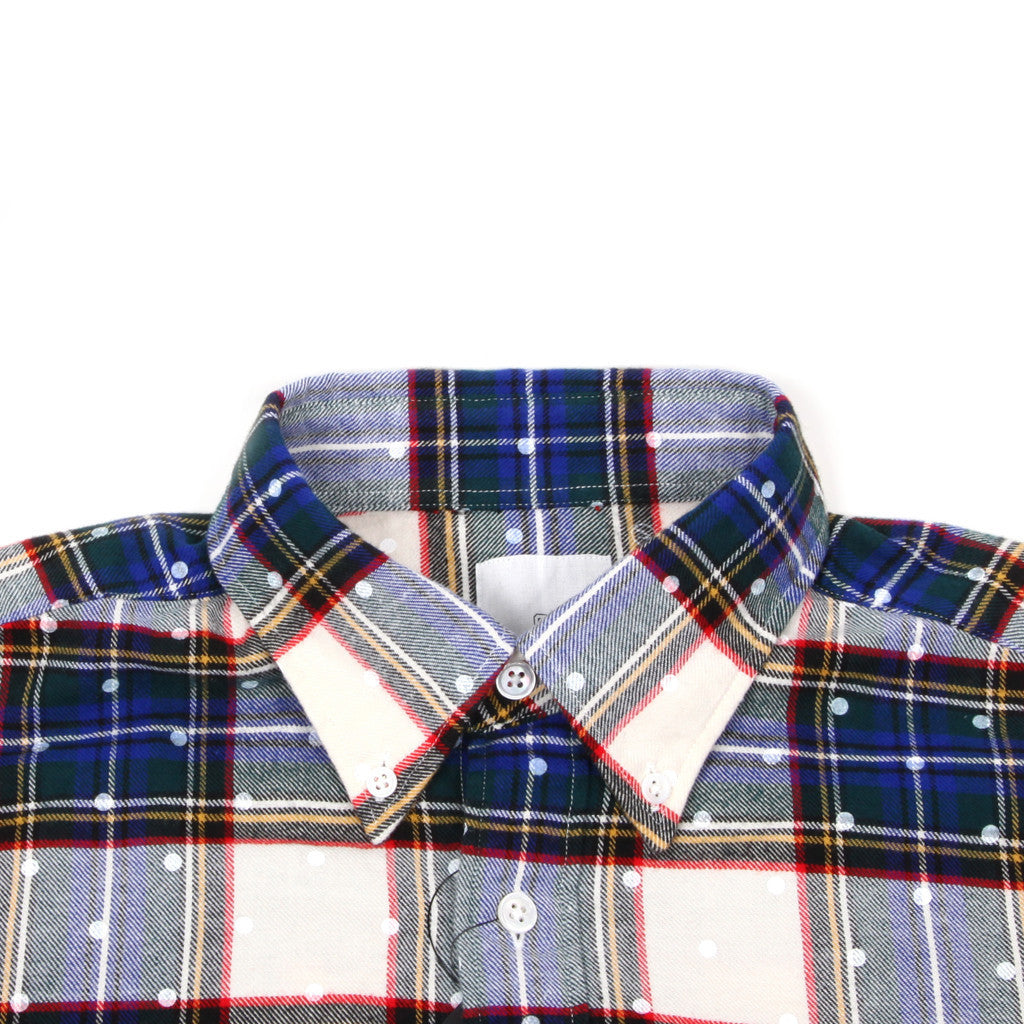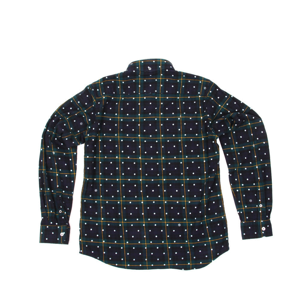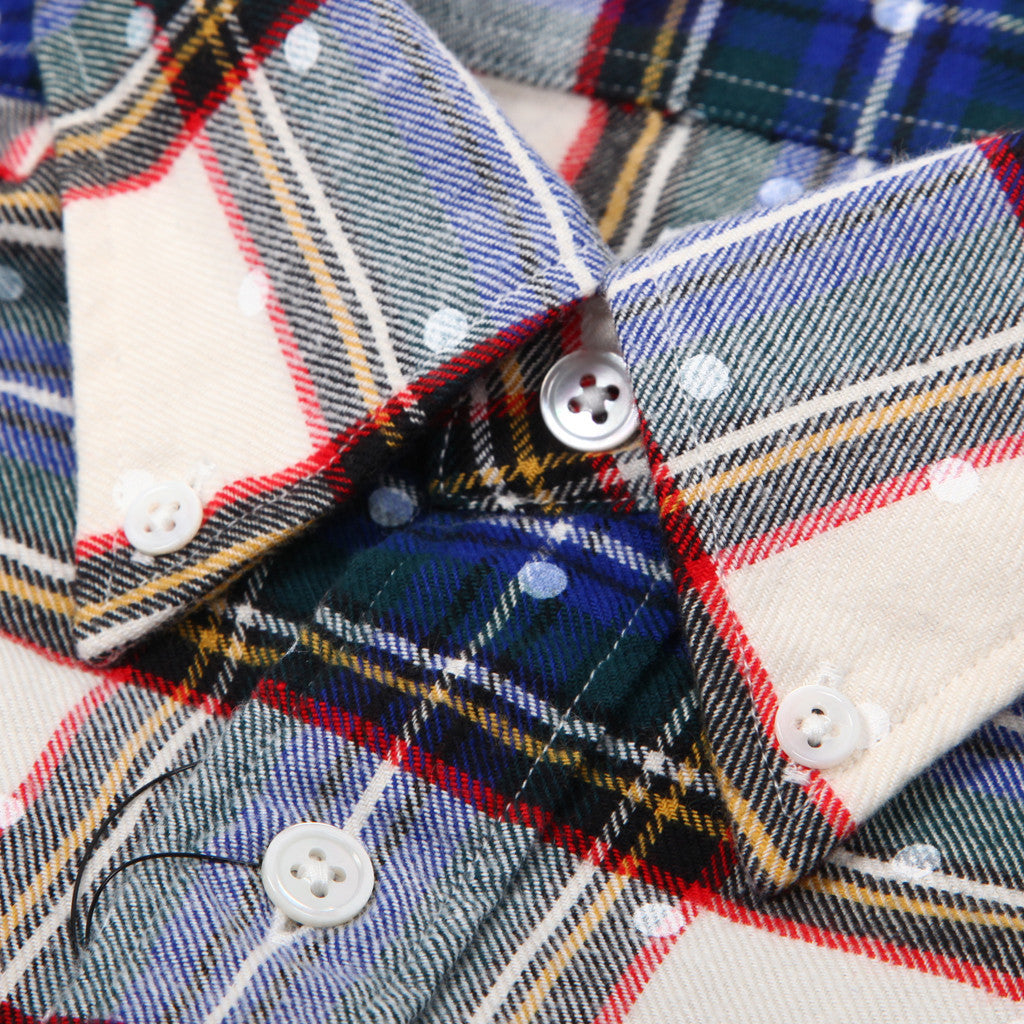 Yarn dyed tartan flannel shirt with button down collar and polka dot over print.