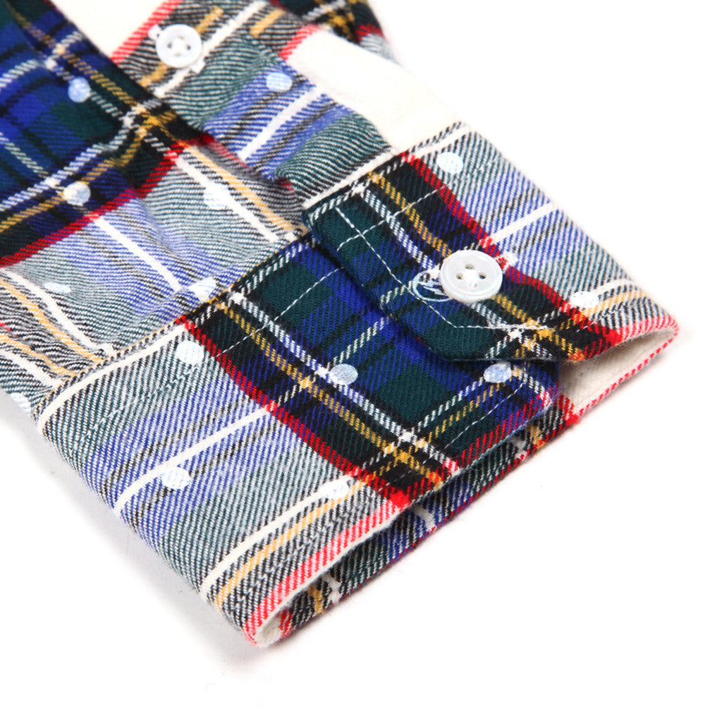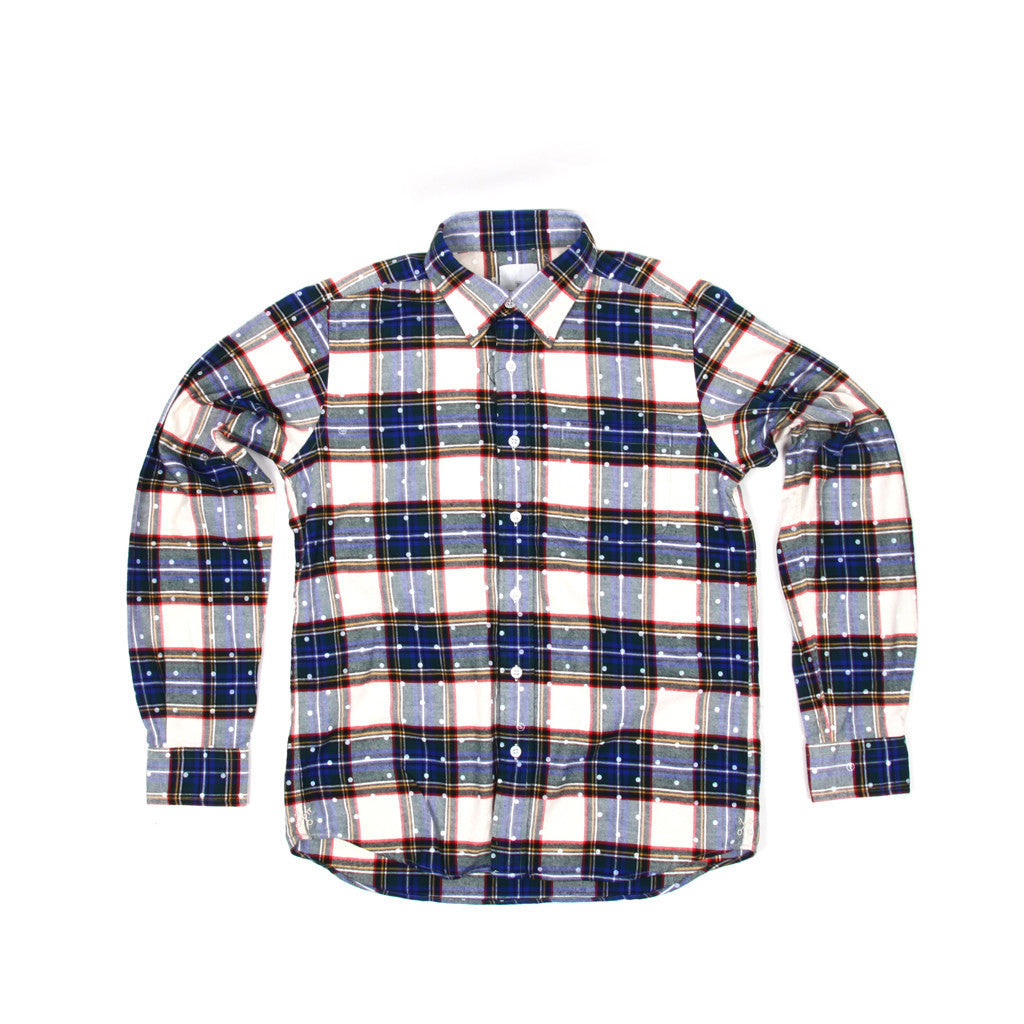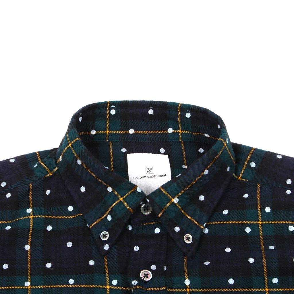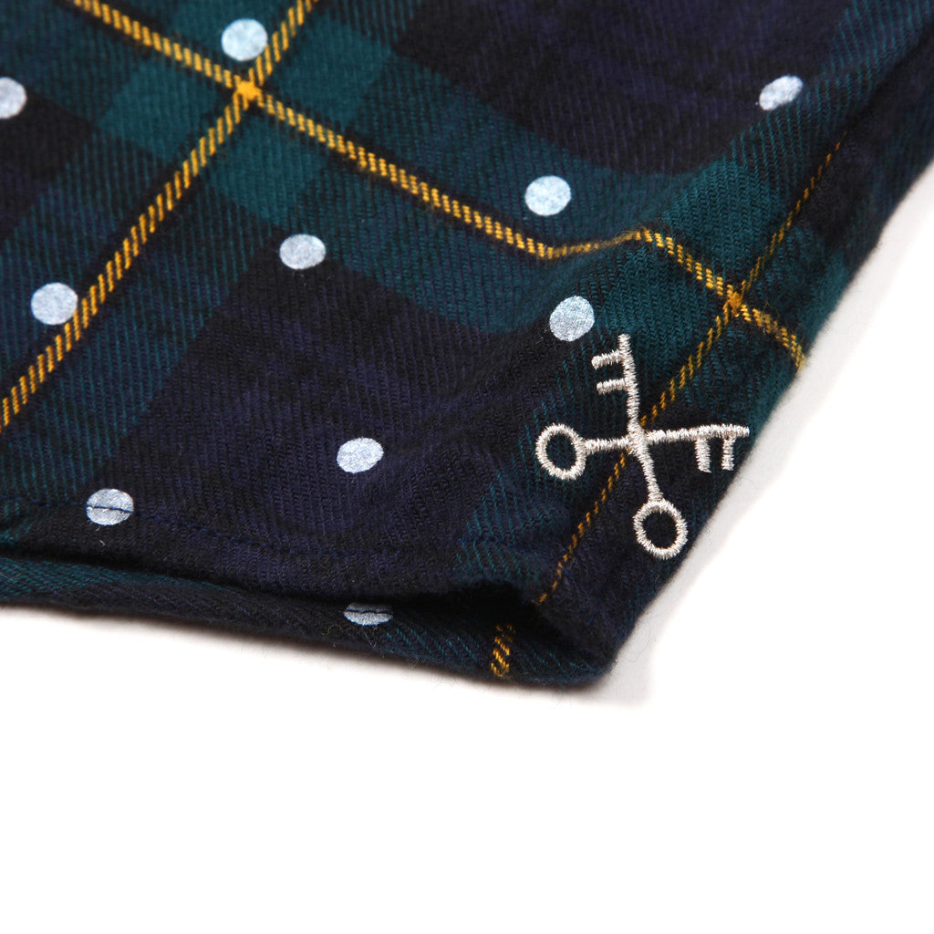 Yarn dyed tartan flannel shirt with button down collar and polka dot over print.