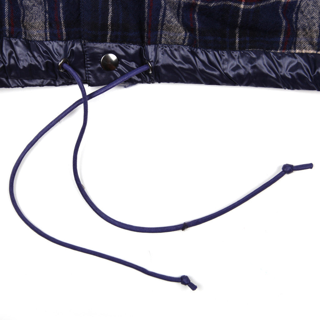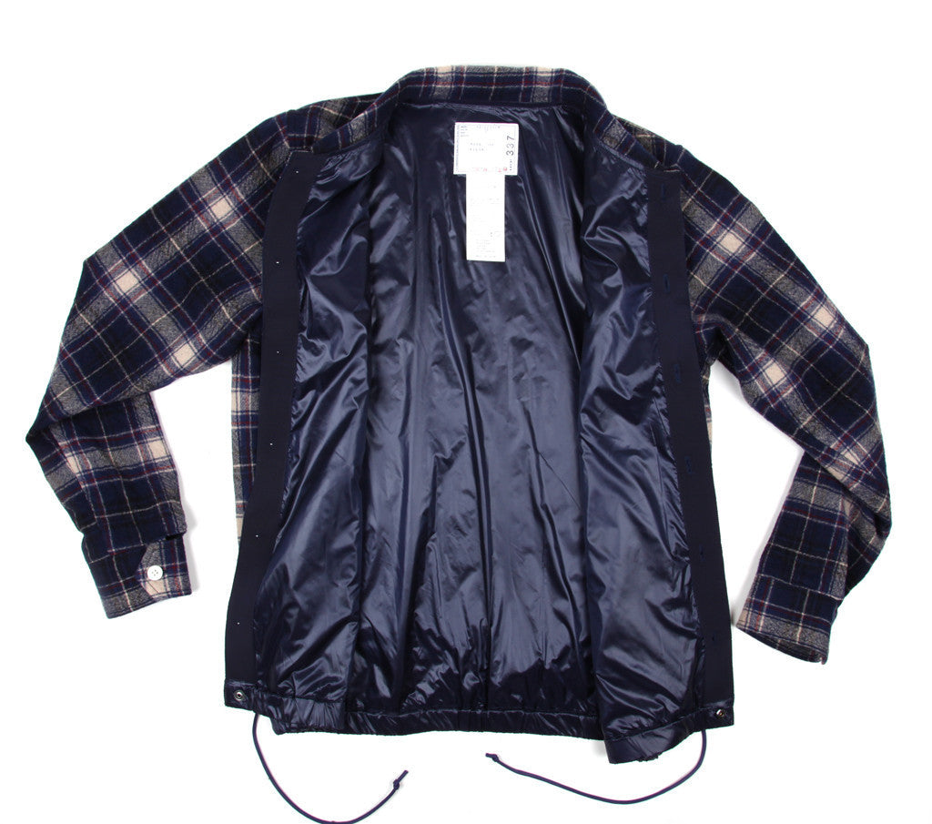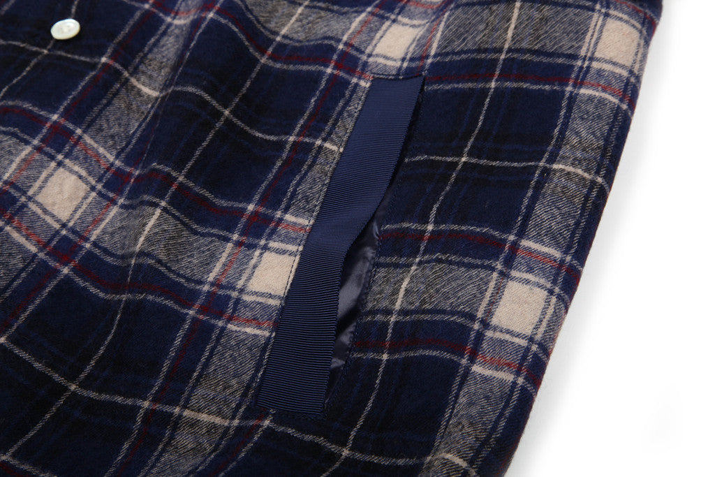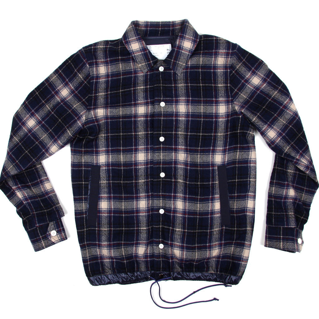 Lined wool button front flannel coaches jacket with drawstring hem and grosgrain welt pockets.