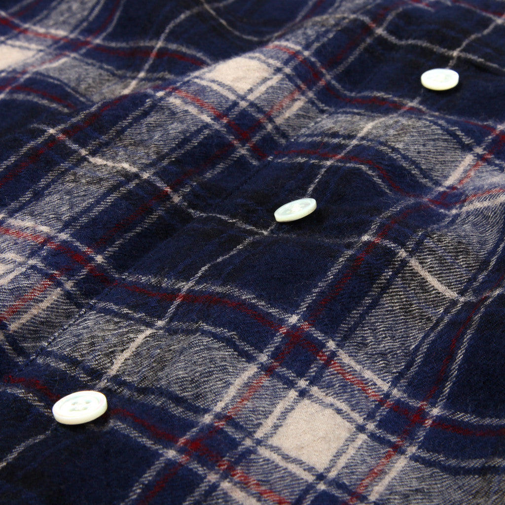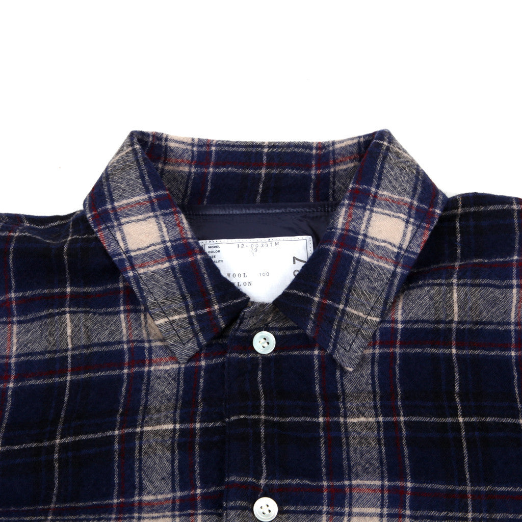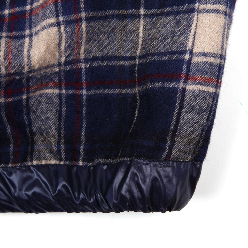 Lined wool button front flannel coaches jacket with drawstring hem and grosgrain welt pockets.