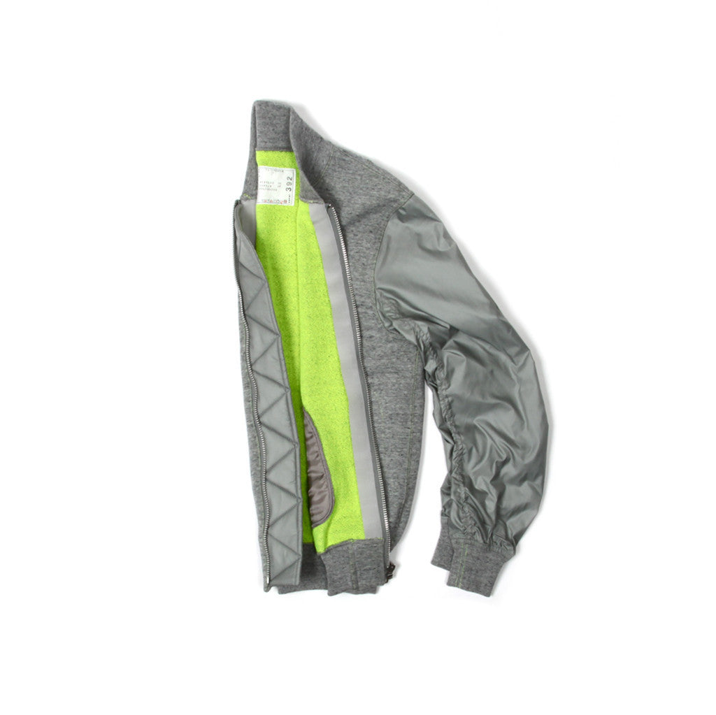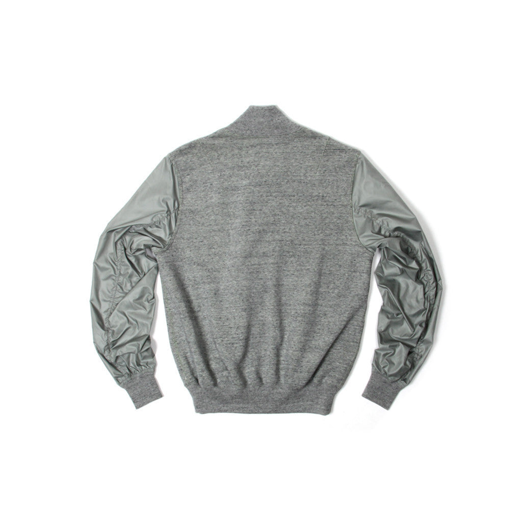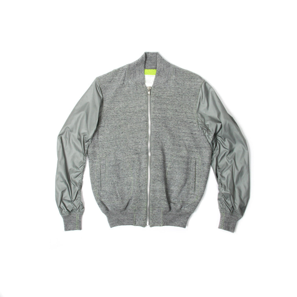 Casual MA-1 bomber with a French terry body with contrast inside color and nylon sleeves.