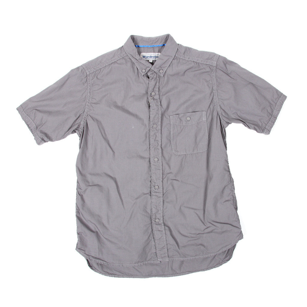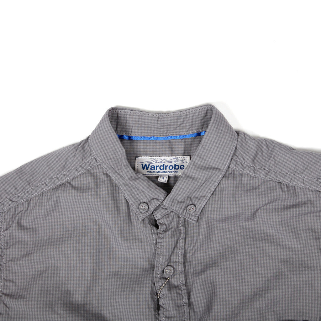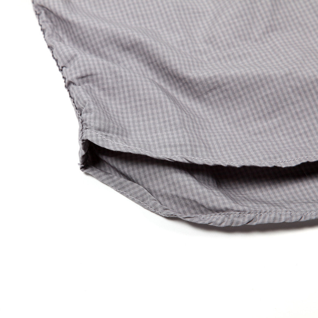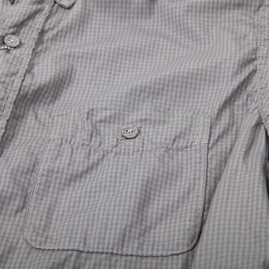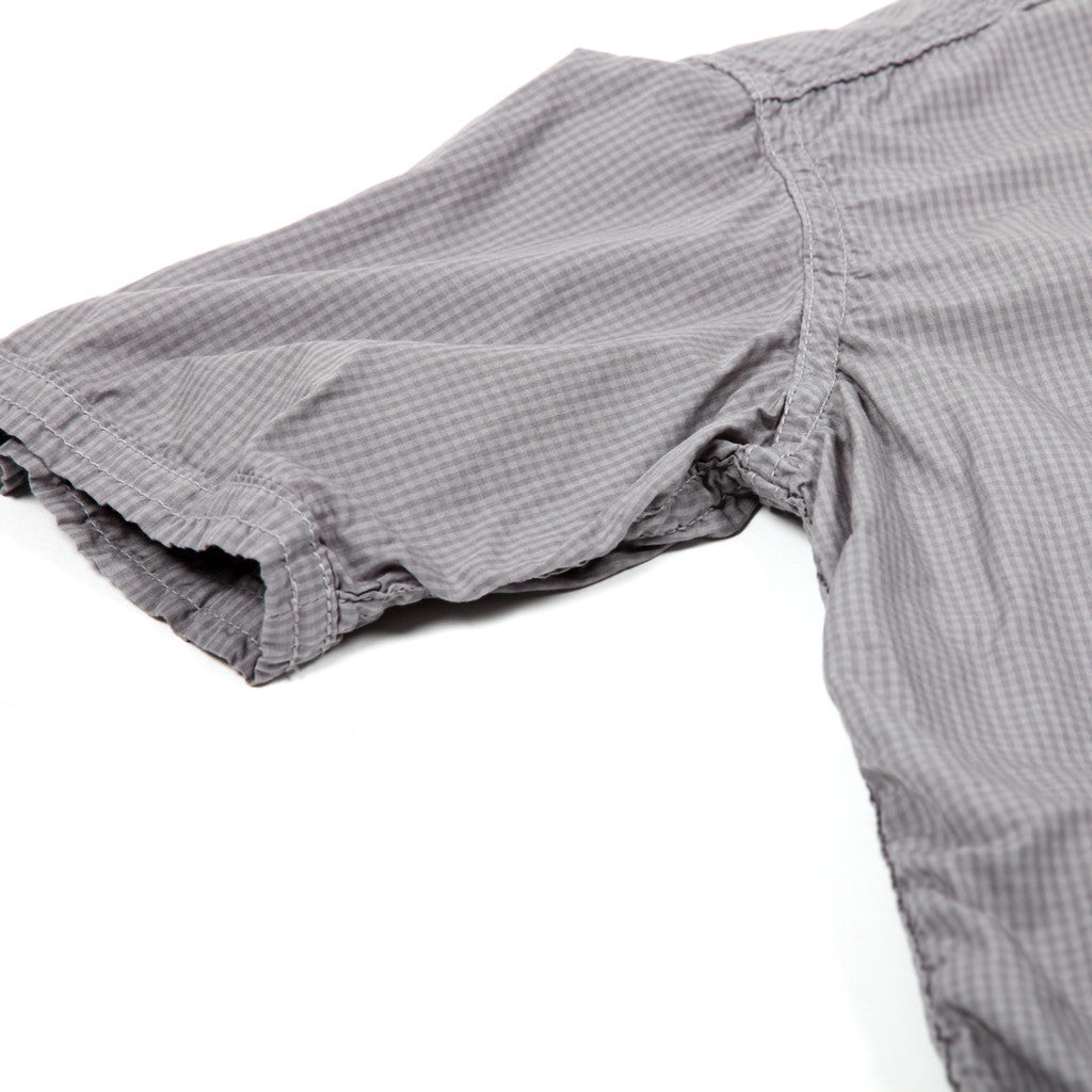 A subtle over dye gingham button down check shirt. Has a single chest pocket and reinforced gusset tabs.