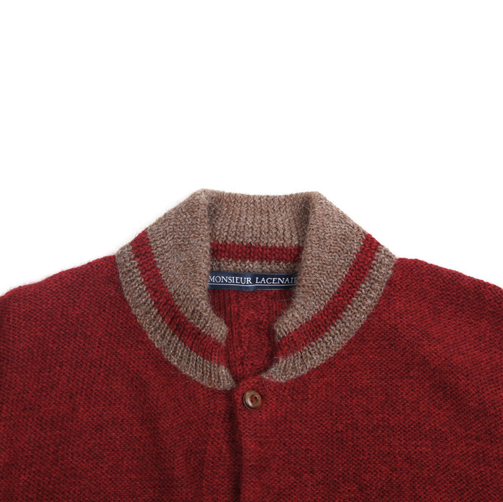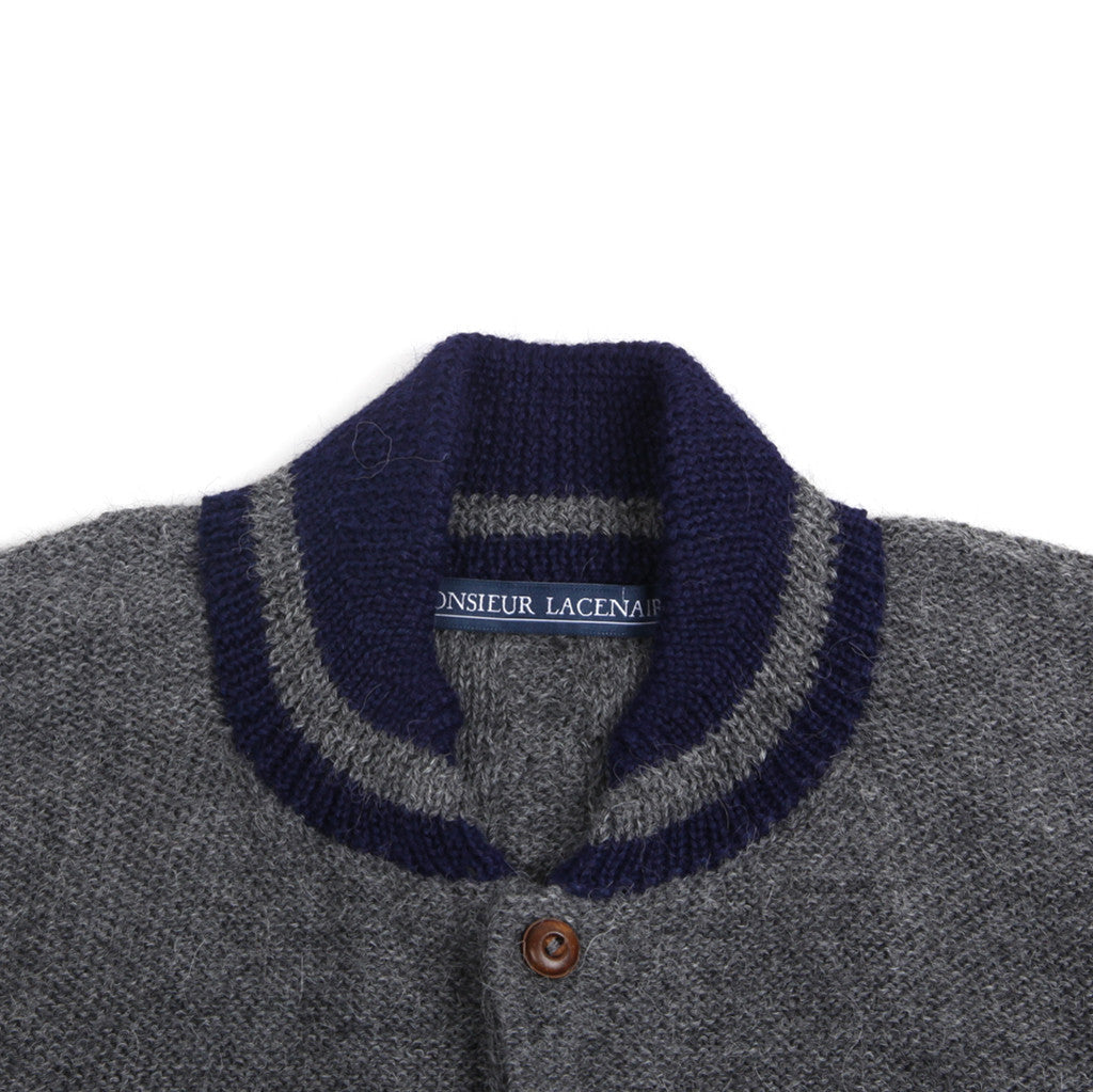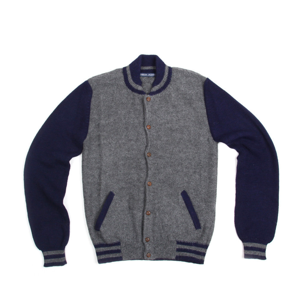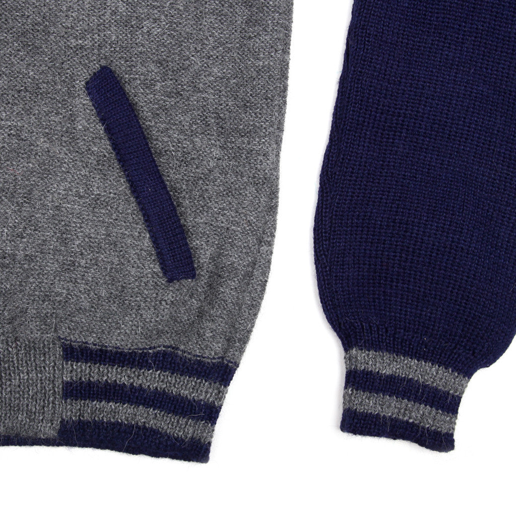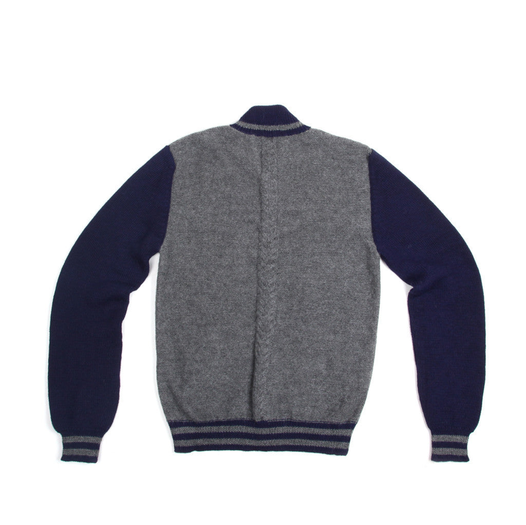 A take on a varsity jacket which is made of a superfine alpaca wool which has a contrast sleeve and cable knit stripe down the back for a nice touch of detail. A twist on the modern classic....