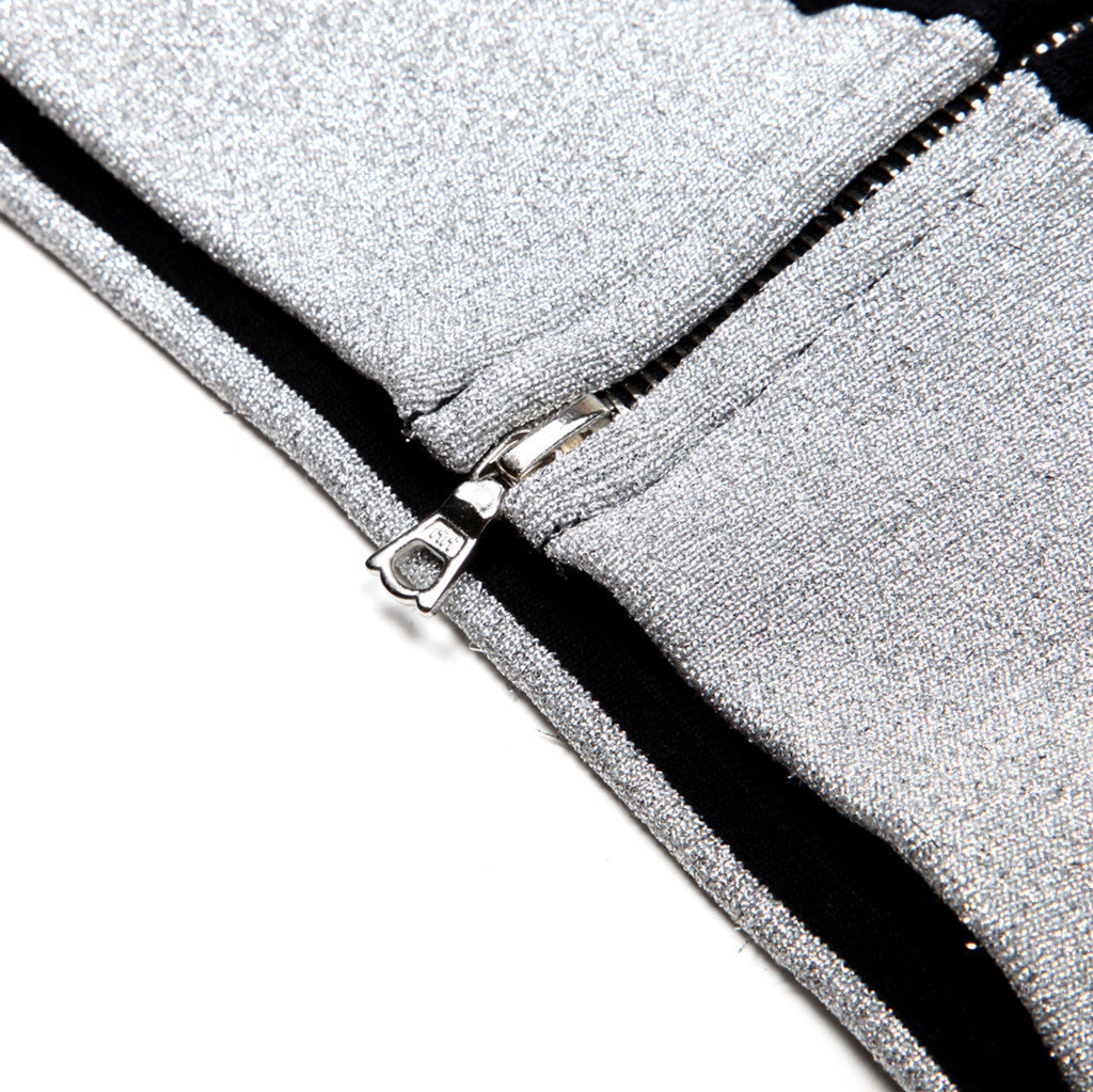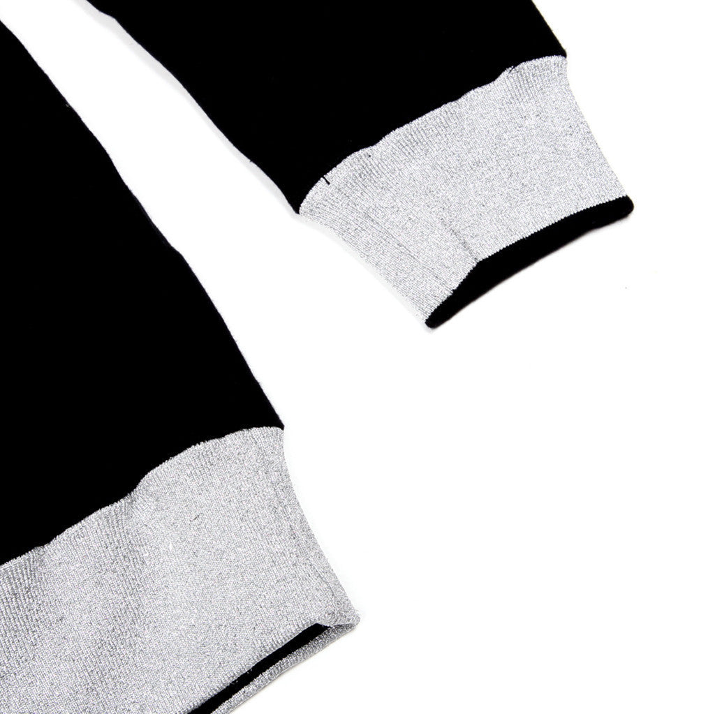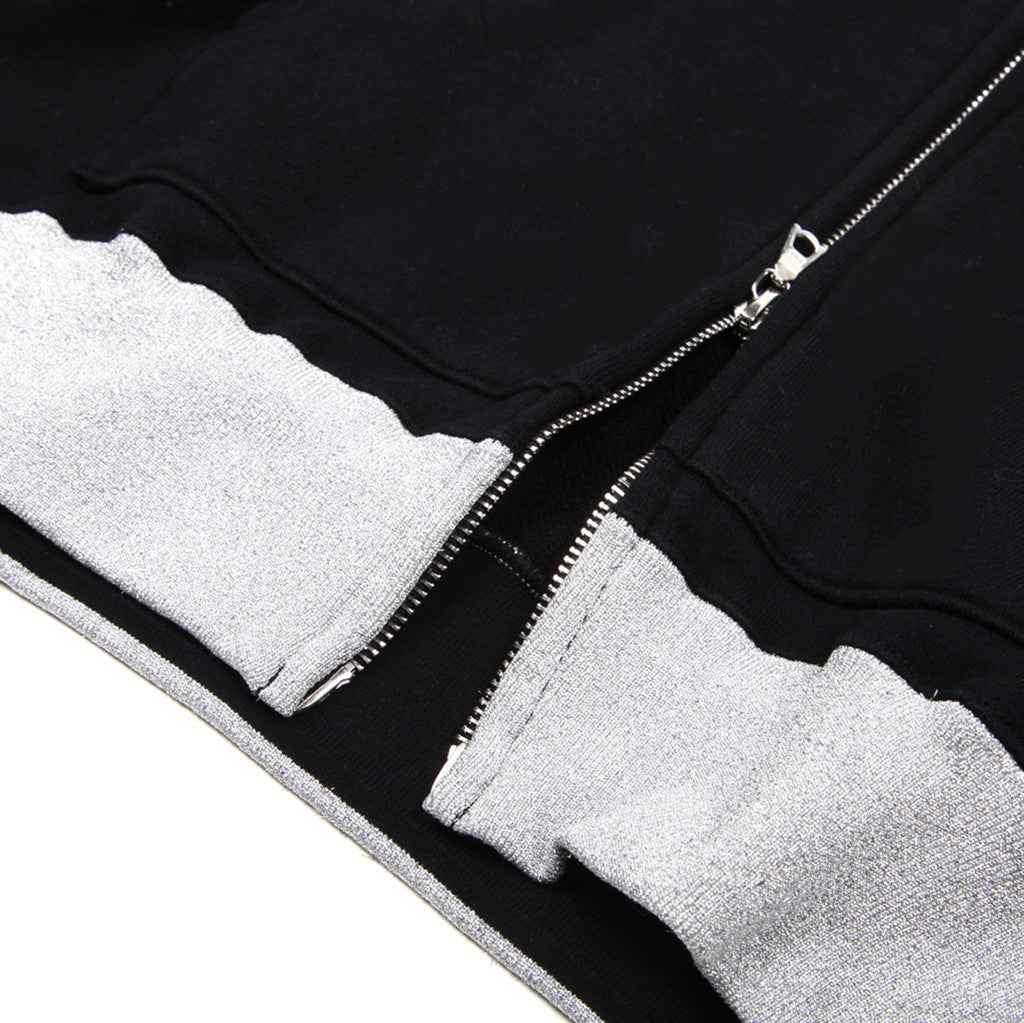 Straight to the point...Black zip up hoodie with metallic silver ribbed cuffs on the sleeves and waistband.