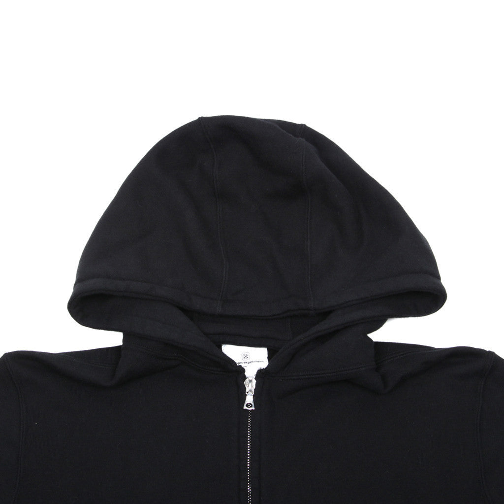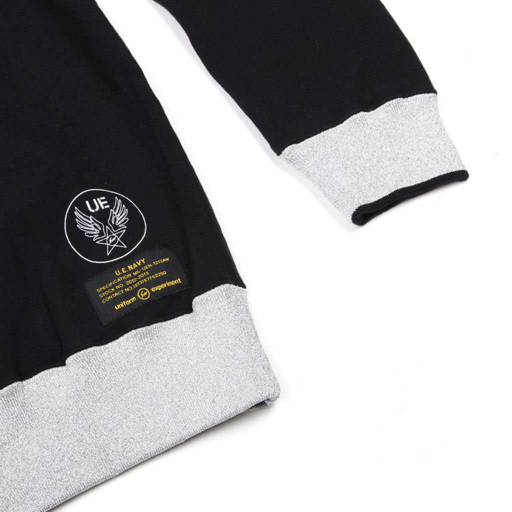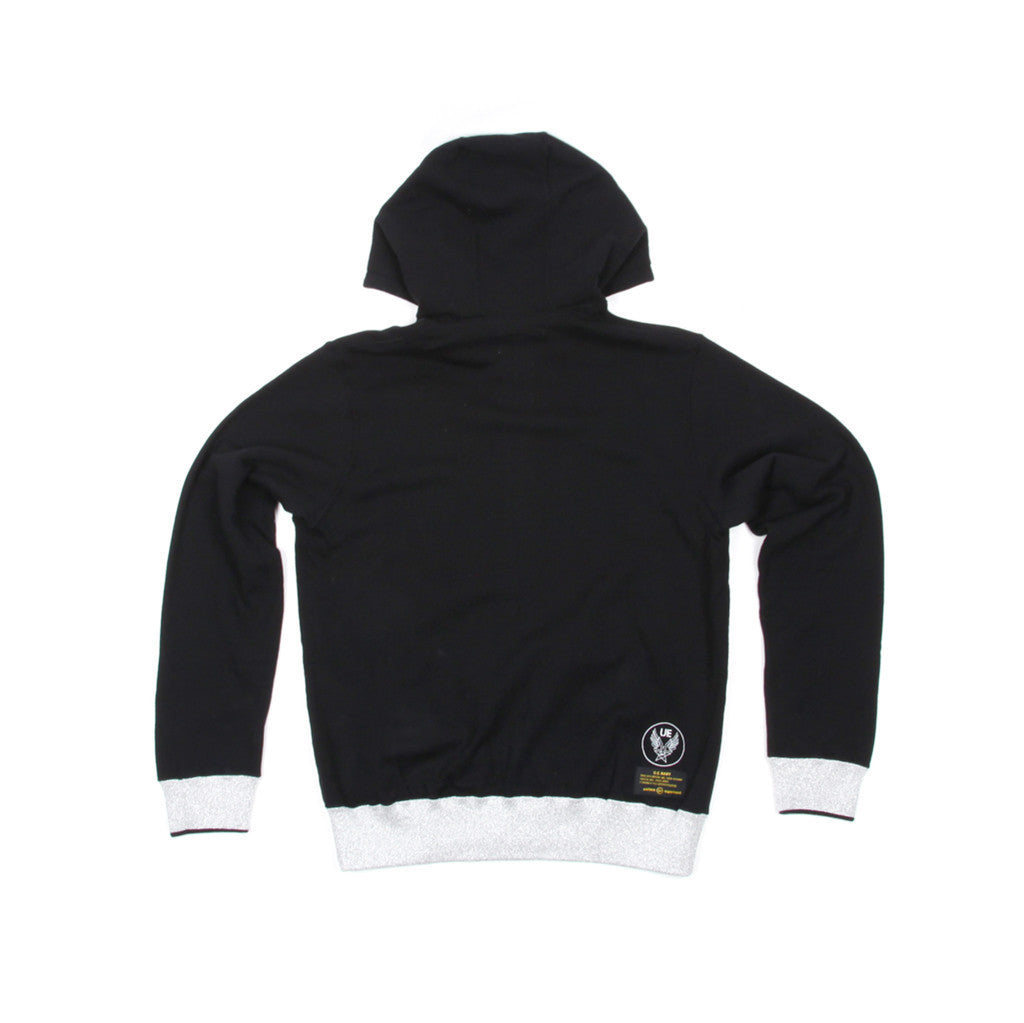 Straight to the point...Black zip up hoodie with metallic silver ribbed cuffs on the sleeves and waistband.