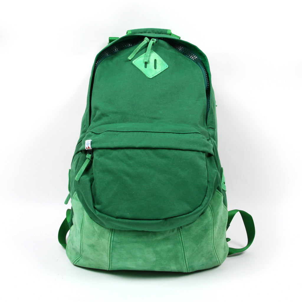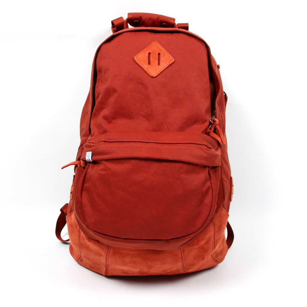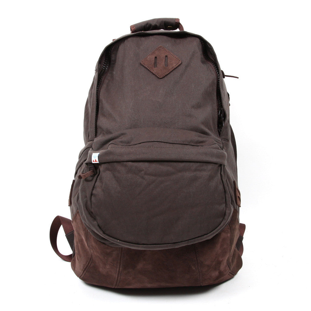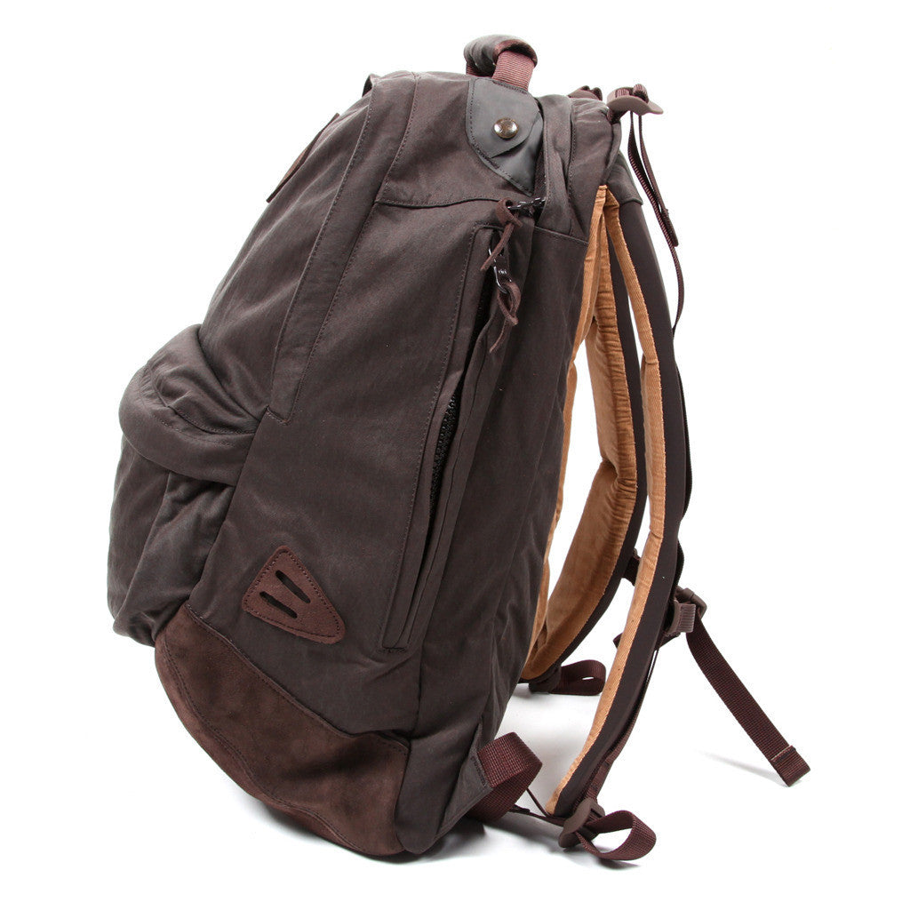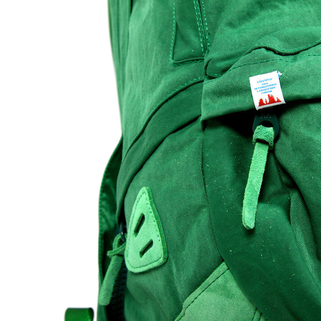 This is the 22L Lamina backpack. The outer material on this season's bags is Lamina which is a Japanese fabric often called Kombu. It is a baked over-dyed nylon. This process of baking the nylon gives it a more organic, canvas like texture and look. The bottom of the bag is a tonal Kudu suede. The padded straps, back, and waist band are covered in Italian corduroy. All Visvim bags use Riri zippers.