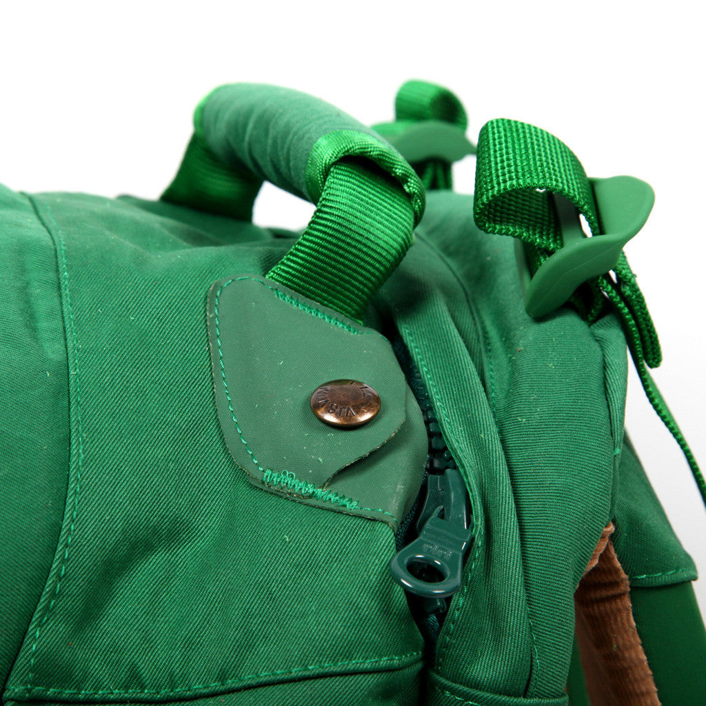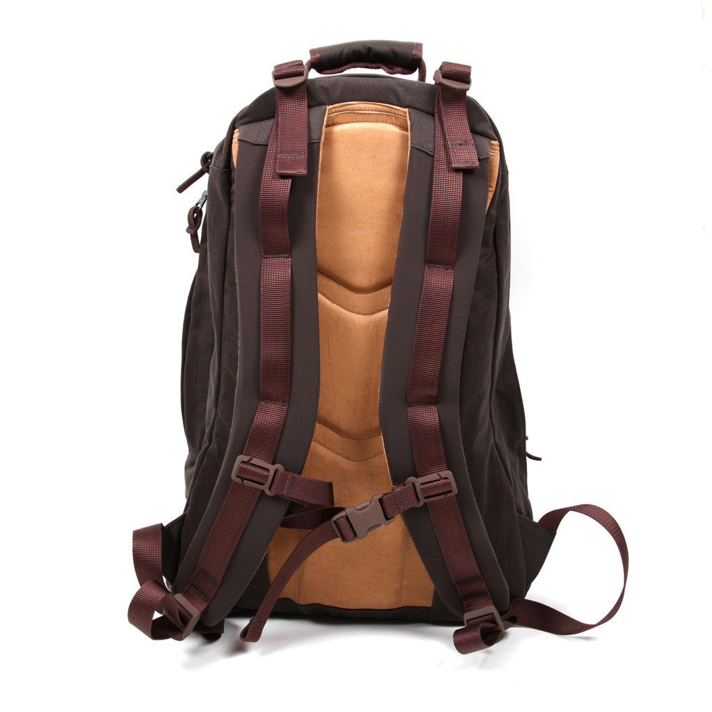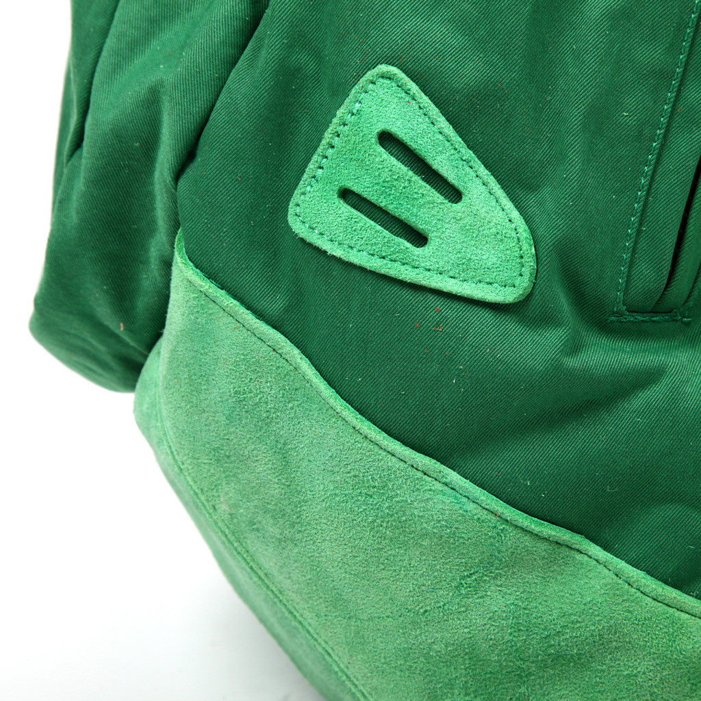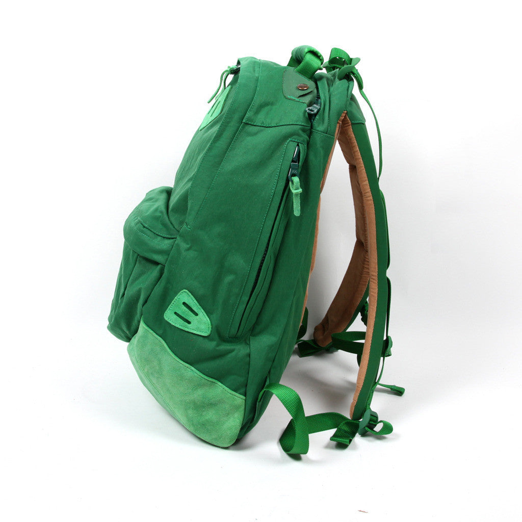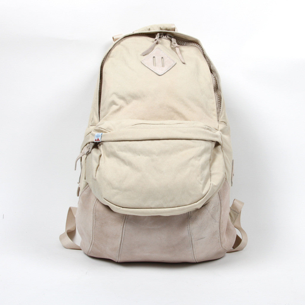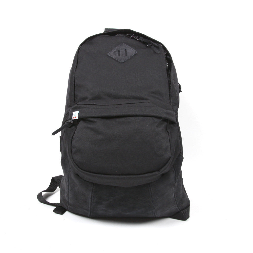 This is the 22L Lamina backpack. The outer material on this season's bags is Lamina which is a Japanese fabric often called Kombu. It is a baked over-dyed nylon. This process of baking the nylon gives it a more organic, canvas like texture and look. The bottom of the bag is a tonal Kudu suede. The padded straps, back, and waist band are covered in Italian corduroy. All Visvim bags use Riri zippers.