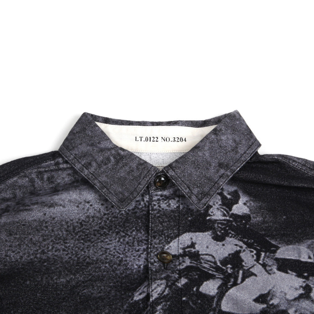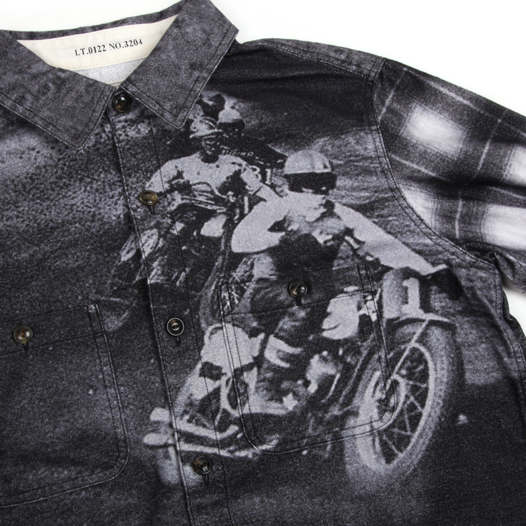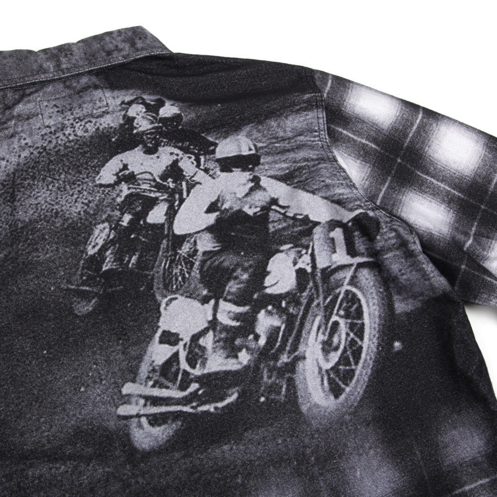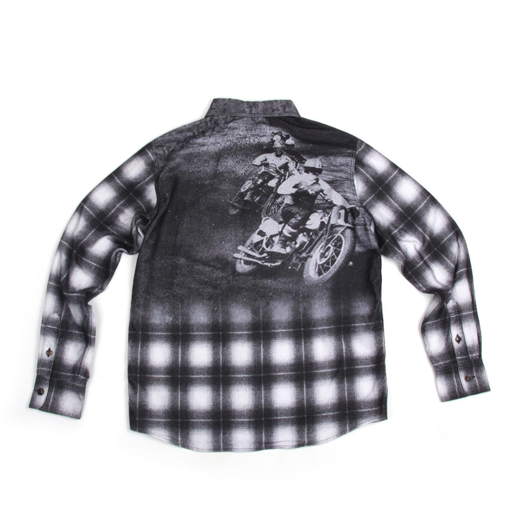 A virtual print flannel shirt of a old school motorcycle race which translate over to the back part of the shirt. Lightweight with a soft hand feel.