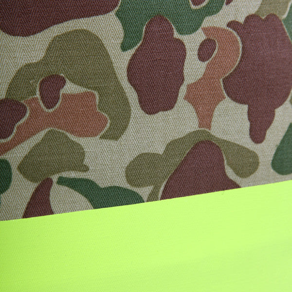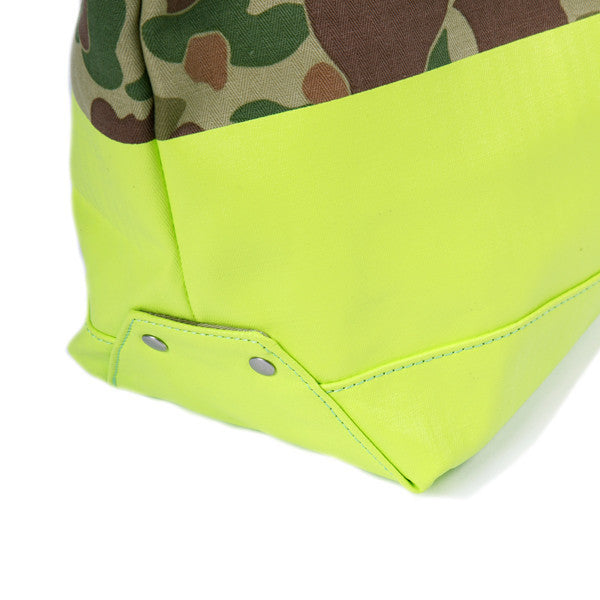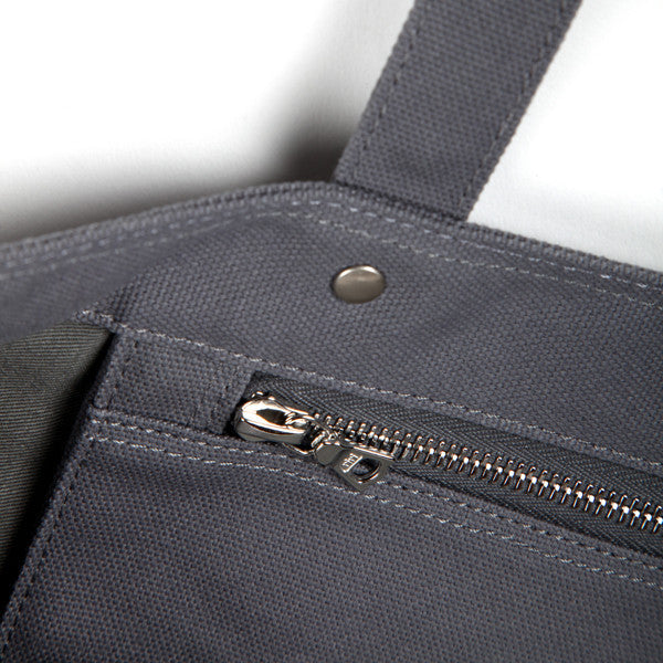 Made of a HBT/canvas with a painted bottom. Open top with a zip pouch within the tote.