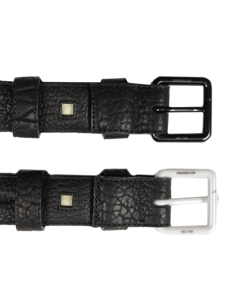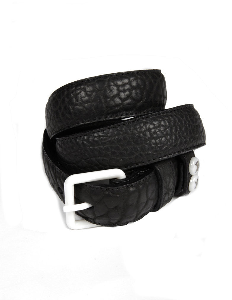 This belt is made with deeply textured Reservation Bison™ shoulder on both the inside and the outside. There is an internal layer of Kevlar for strength and durability. Removable Belt Stay with two laser etched, ceramic covered PRYM™ Snaps. Strap measures 1.5” tall, 7mm thick; Buckle measures 2” x 2” Belt can pass through a metal detector without setting it off. Ceramic Buckle is hand polished for 15 hours, giving it a jewelry quality finish. Individually numbered Buckle. Available with either white or black ceramic hardware.