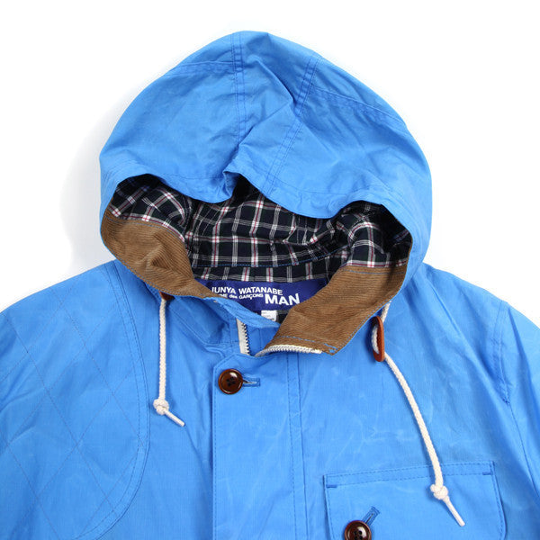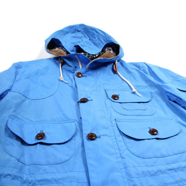 Made of a "Waxed Paraffin" material. Based off a hunting jacket, it has a rear game pouches as well as metal eyelet armpit vents to keep you from getting to warm. Has a zip closure and button storm flap. Plaid lining gives it a nice detail along with a draw string bottom, diamond quilt stitch elbow patch, and button-thru flap pockets.