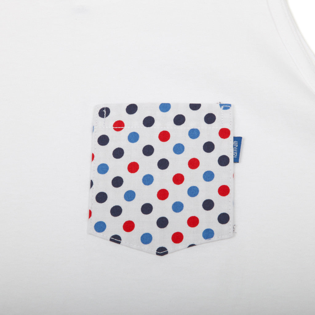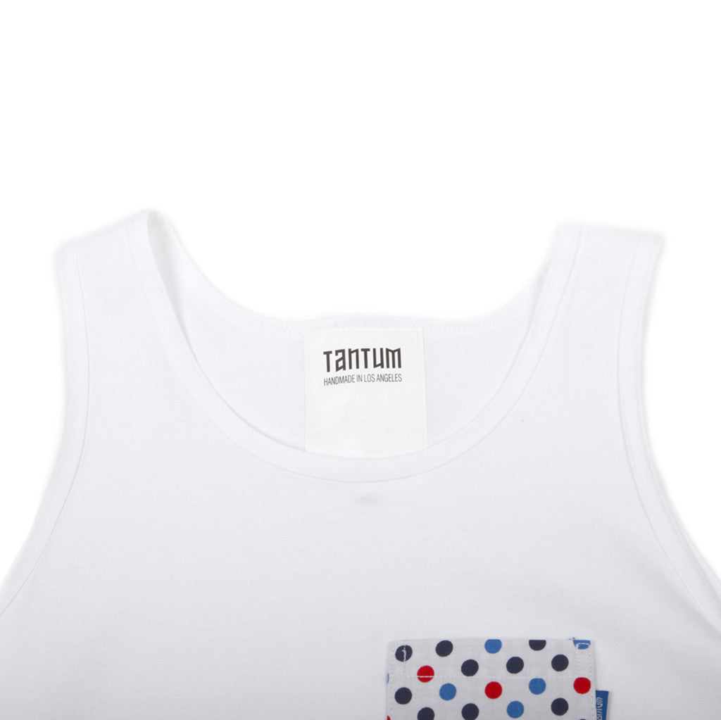 Tantum continues their pocket tees with a limited run of tank tops for Summer. Offered here with a multi color polka dot print pocket on a white tank.