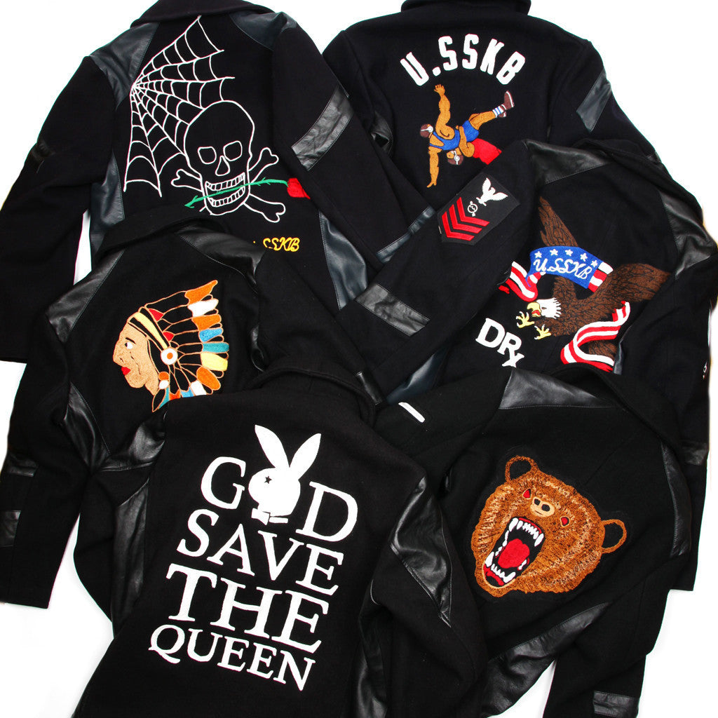 1940's vintage pea coats reconstructed by Dr. Romanelli with custom leathers and zippers. Finished with hand chain stitching.