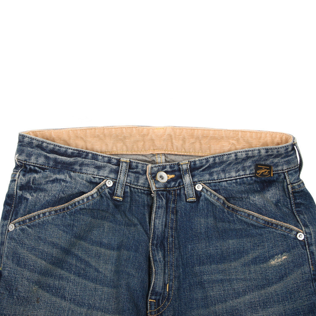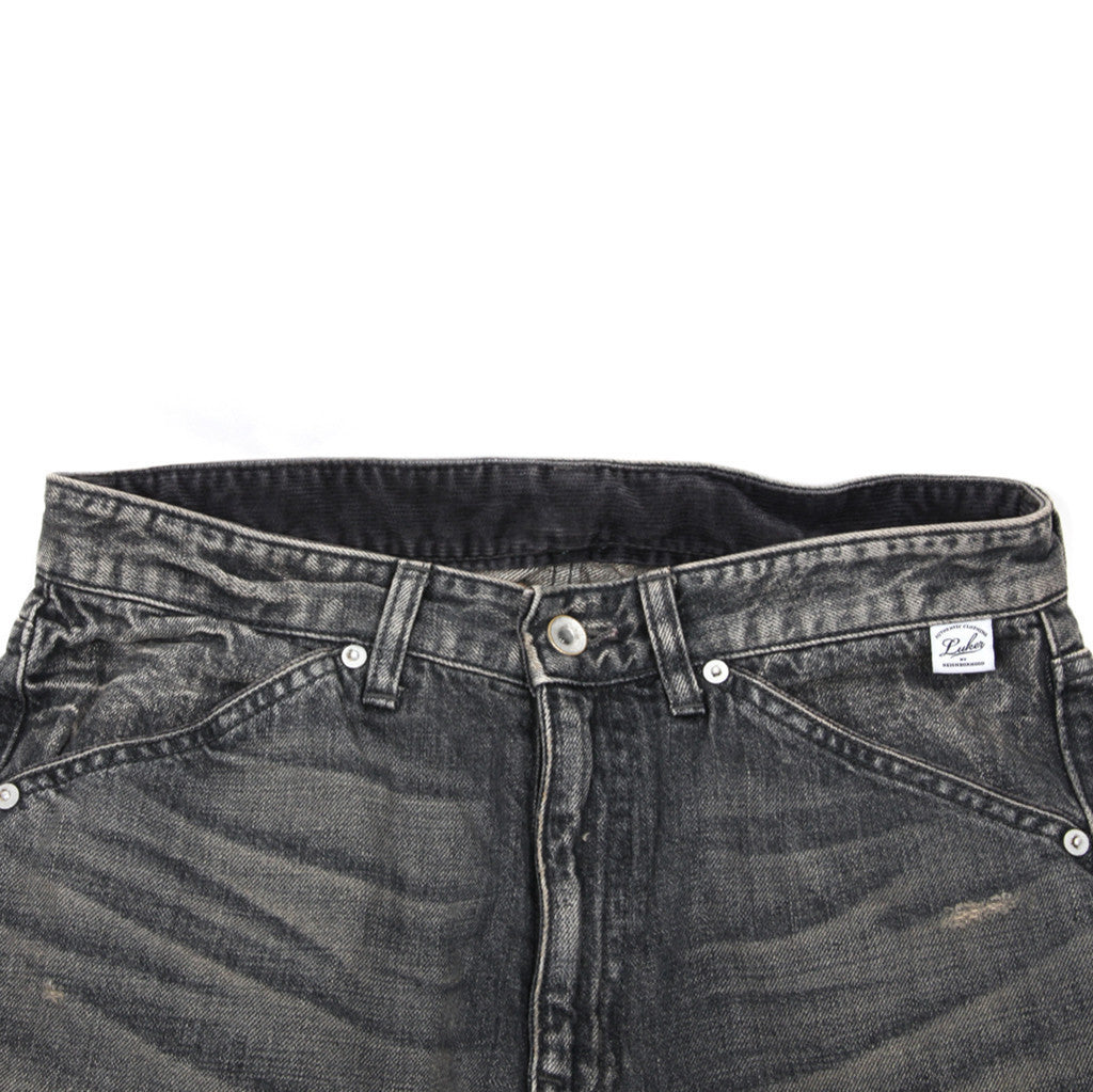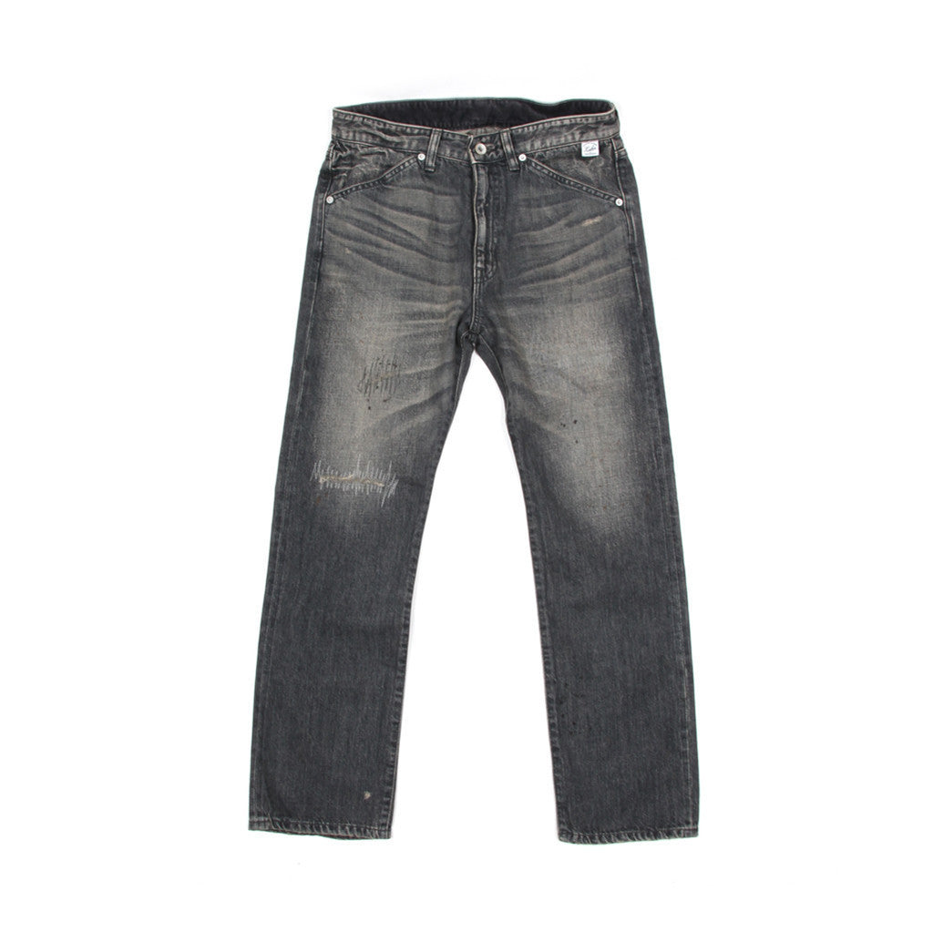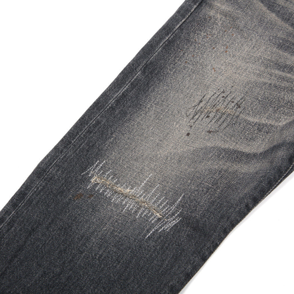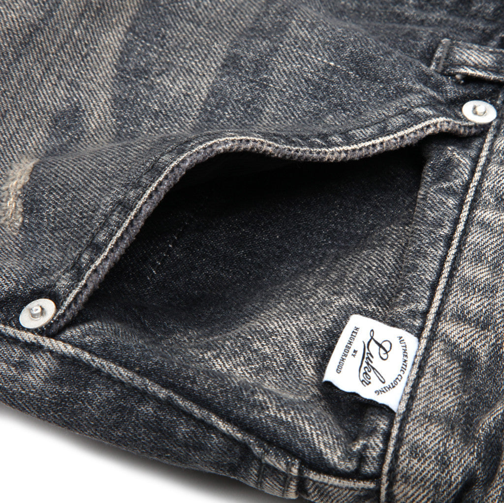 LUKER By Neighborhood is offering these tapered slim distressed and damaged denim with slanted front pockets and corduroy waistband lining.