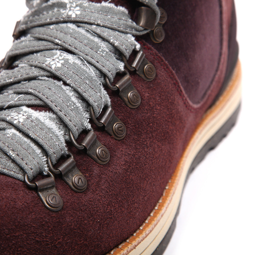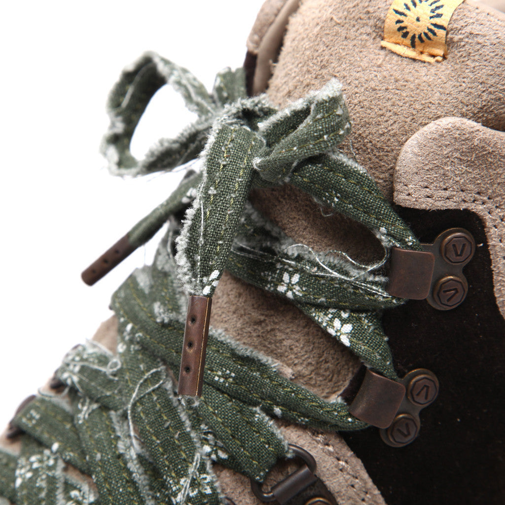 Visvim has brought back the Serra hiking boot again this season. This time around the Serra boot is made in a fine UK suede and has the seasonal theme PIZI printed pattern on the rough edge cotton laces and sports a corduroy panel detail. The Serra is definitely one of Visvim's iconic boot styles. Like most Visvim footwear, this boot features a cork midsole and a TPU heel stabilizer.