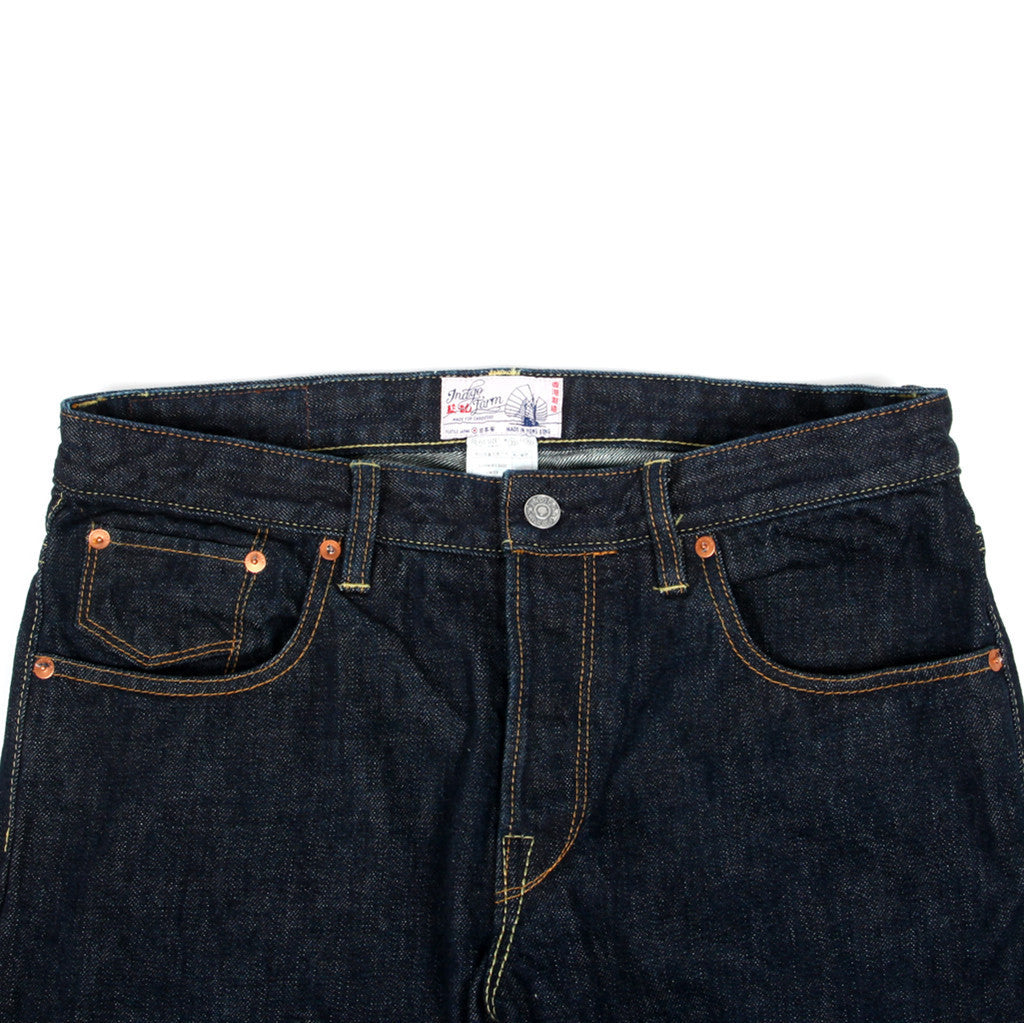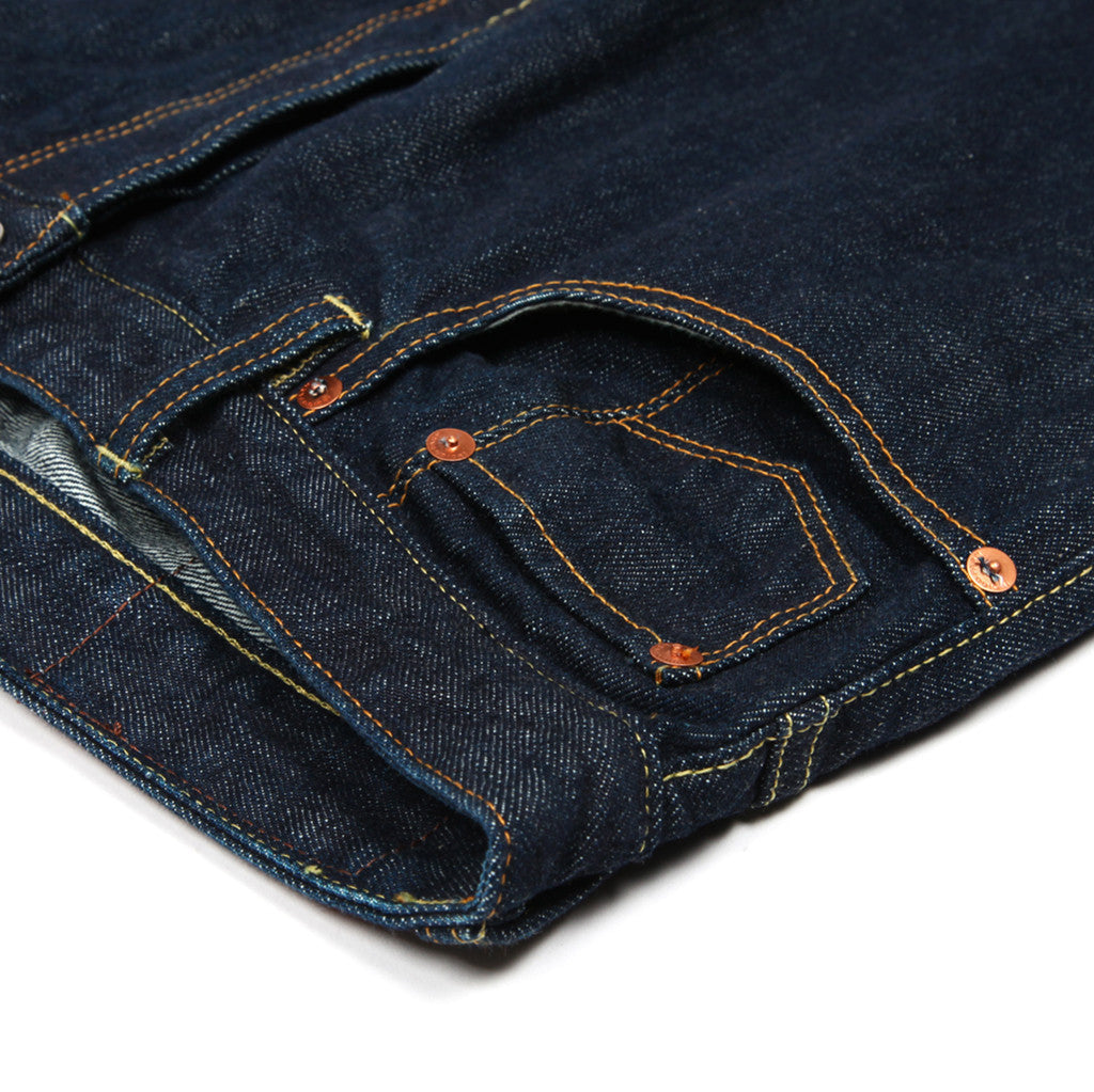 Slim fit tapered indigo jean in a 14 ounce Japanese ring spun true selvedge denim from short loom cloth all rivets,studs, and hardware are Dead Stock vintage materials. "Dead Stock Blue" Embroidery on the rear over the back pocket. Hidden rear pocket rivets.