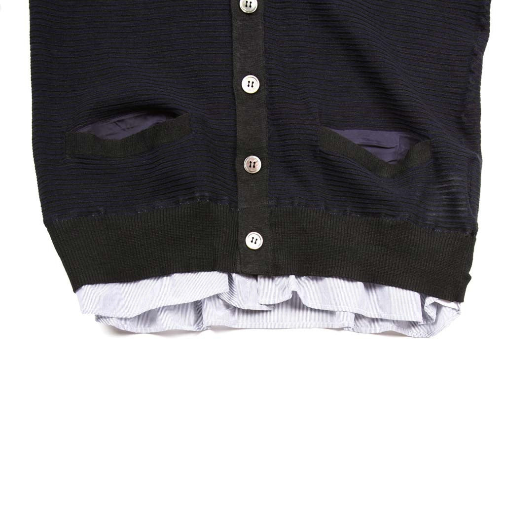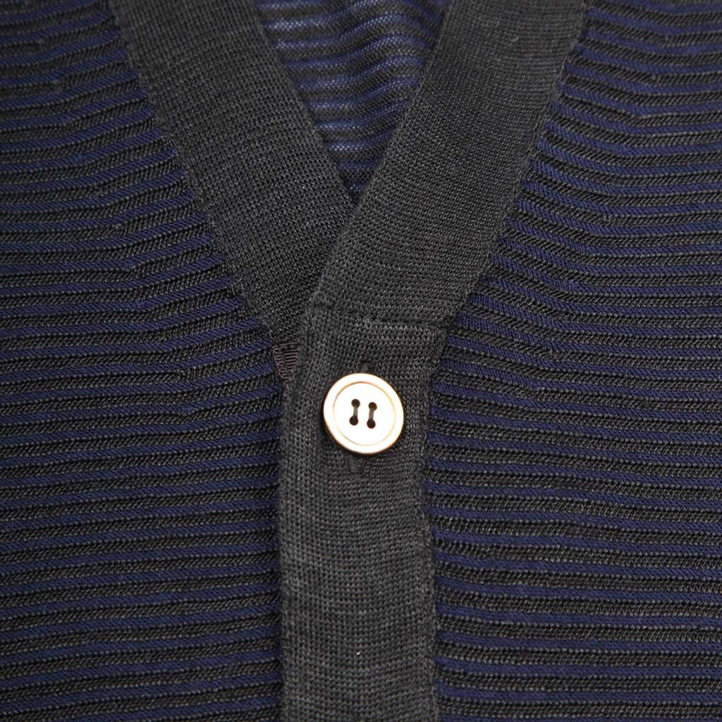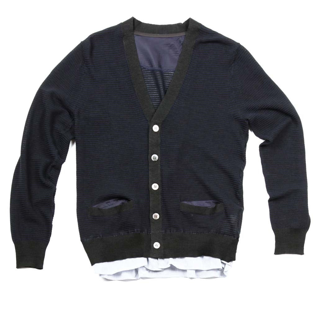 Light weight cardigan with satin lined pockets. Stripe is created by the varied density of the knit. Other details include shirt tails attached to the bottom that hang out under the sweater.